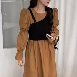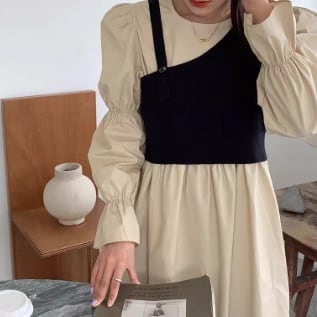 韓国風のスタイルがアクセントを添える不規則スリムニットサスペンダーが、メリハリを効かせています。