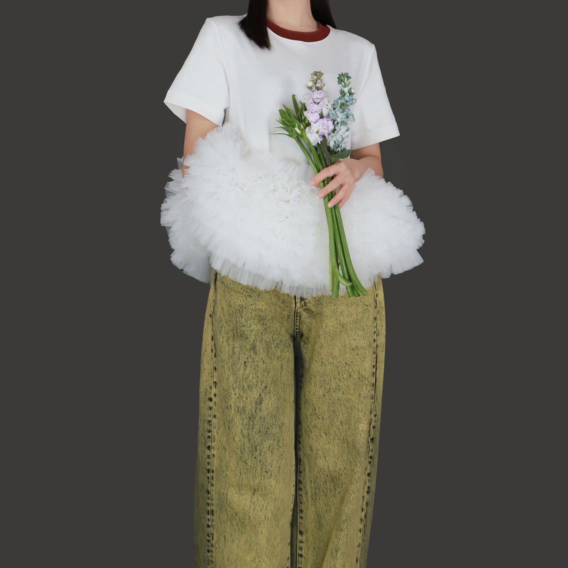 シンプルなボディに、立体感のあるフラワーチュールをドッキングすることで一枚で“雰囲気が出る”主役トップスに仕上がっています。