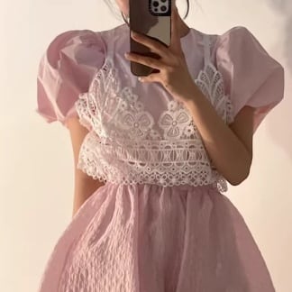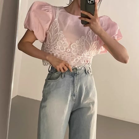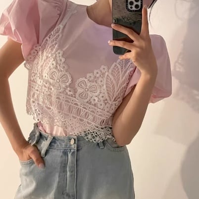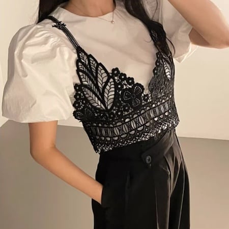 Lace Cami Top & Puff Sleeve Blouse Set*S-613