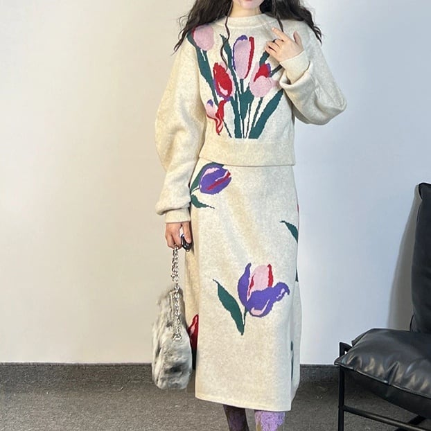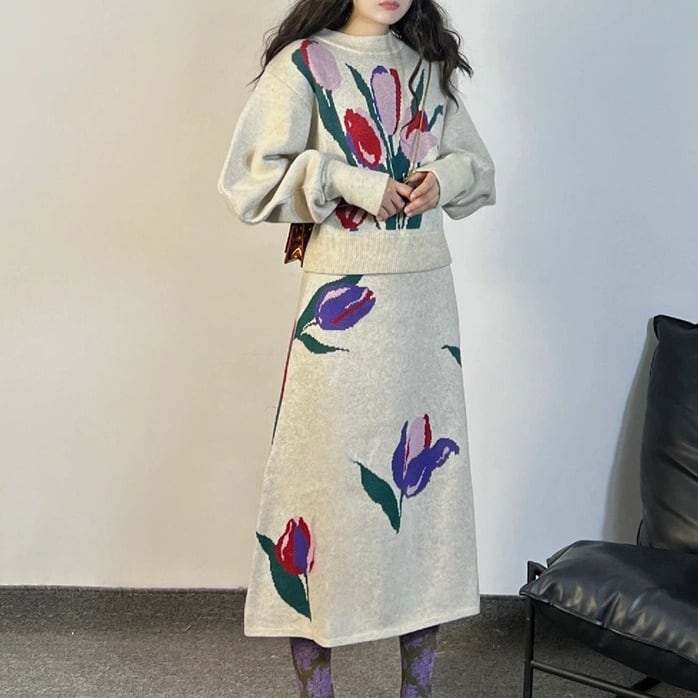 Peach Tulip Knit Top & Midi Skirt Set*S-72