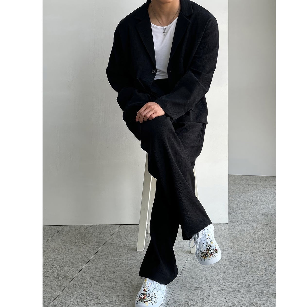 ワッシャー加工を施したmen'sのジャケットとパンツのセットアップ