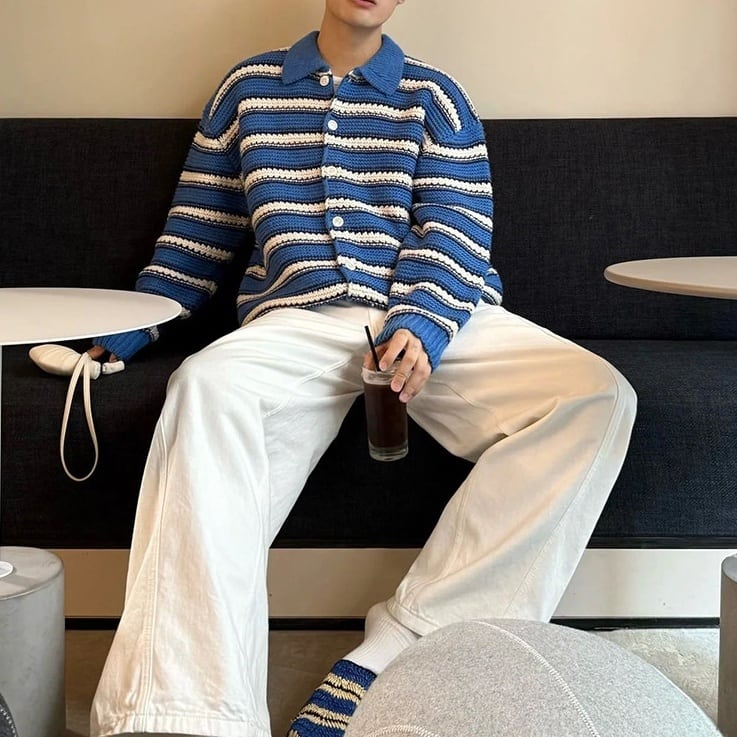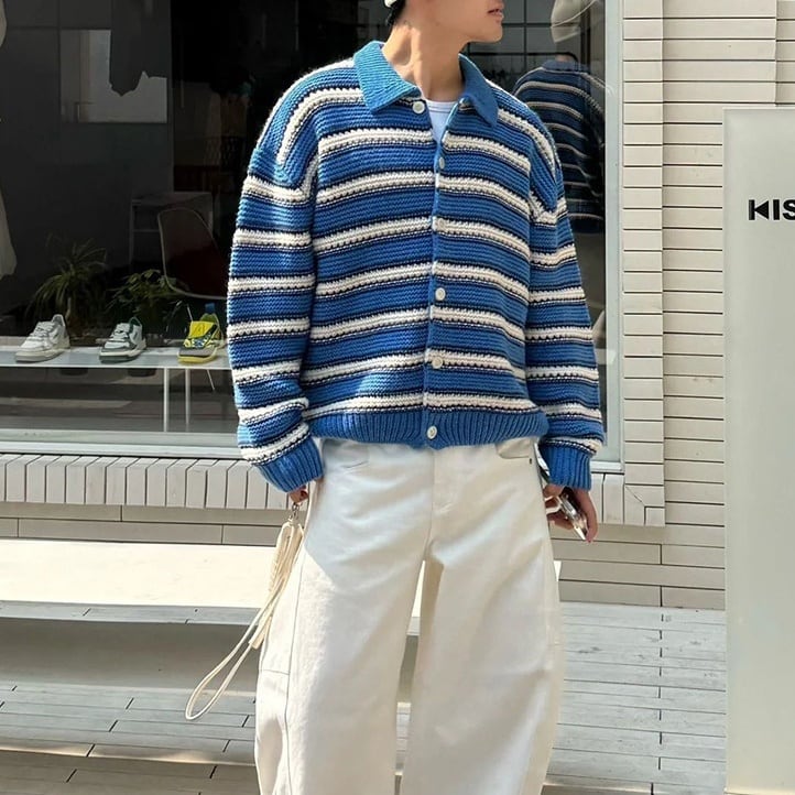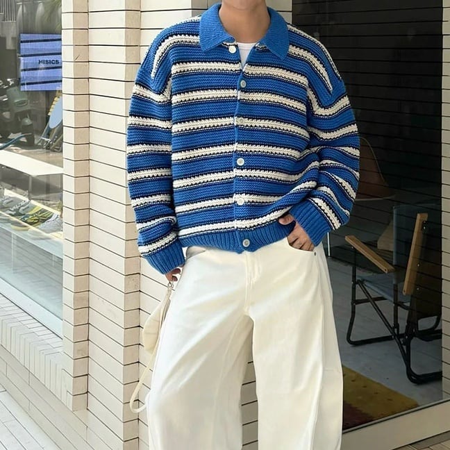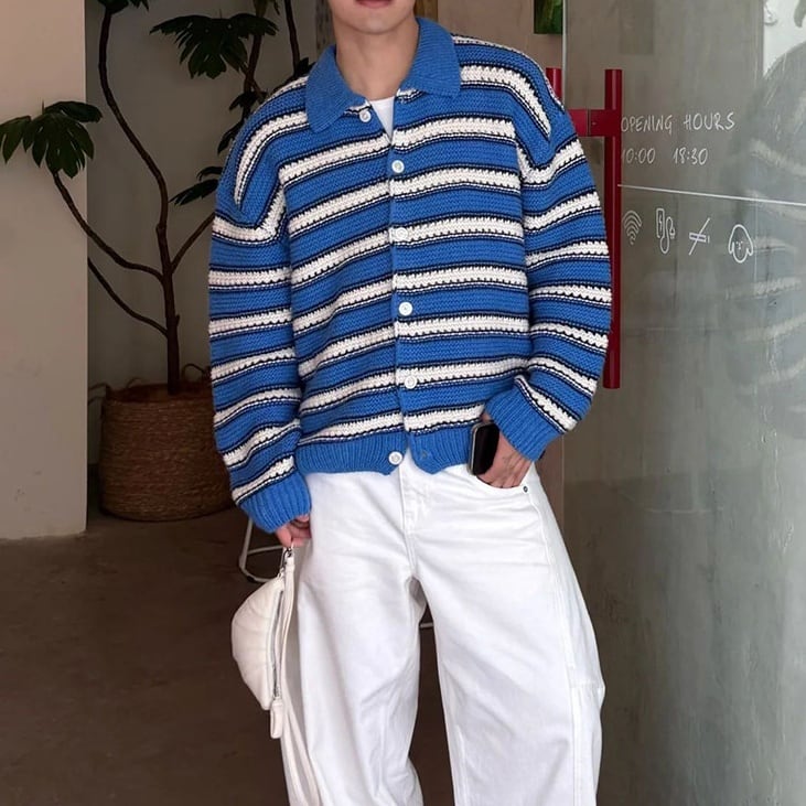 爽やかな配色が印象的な、ボーダー柄ニットカーディガン。
