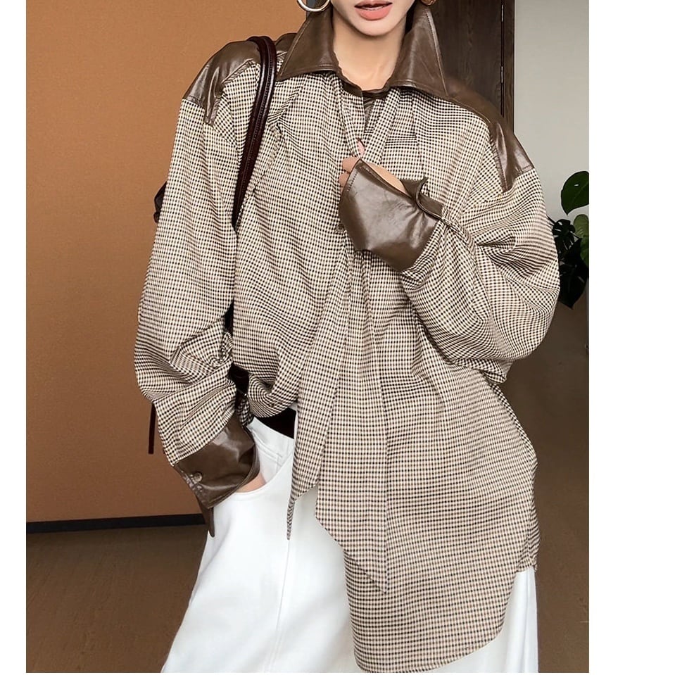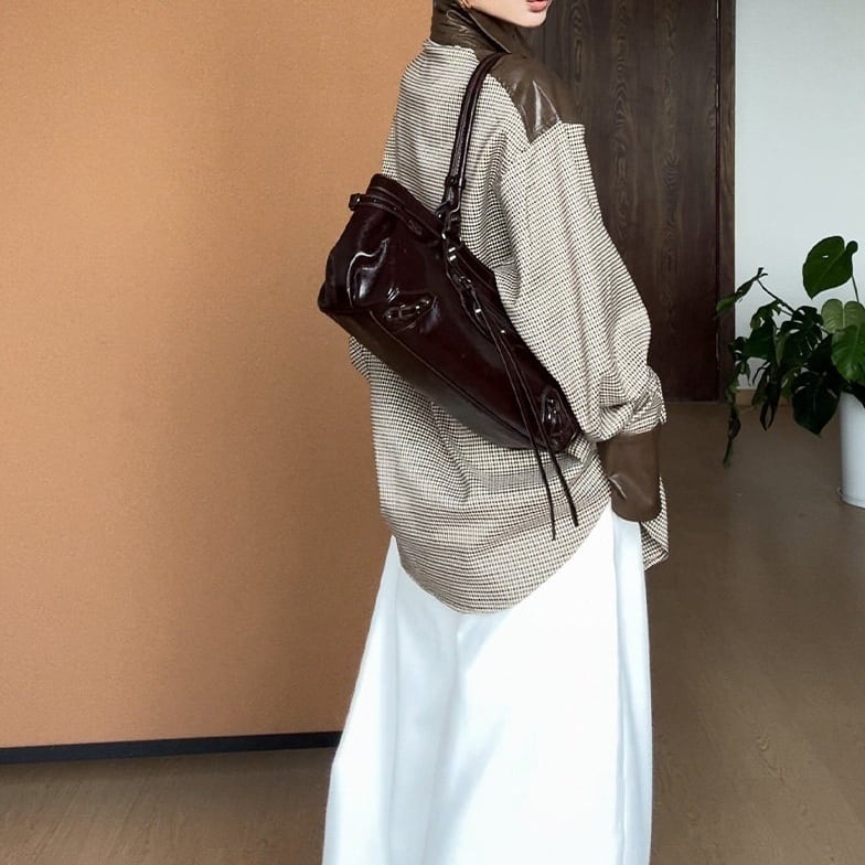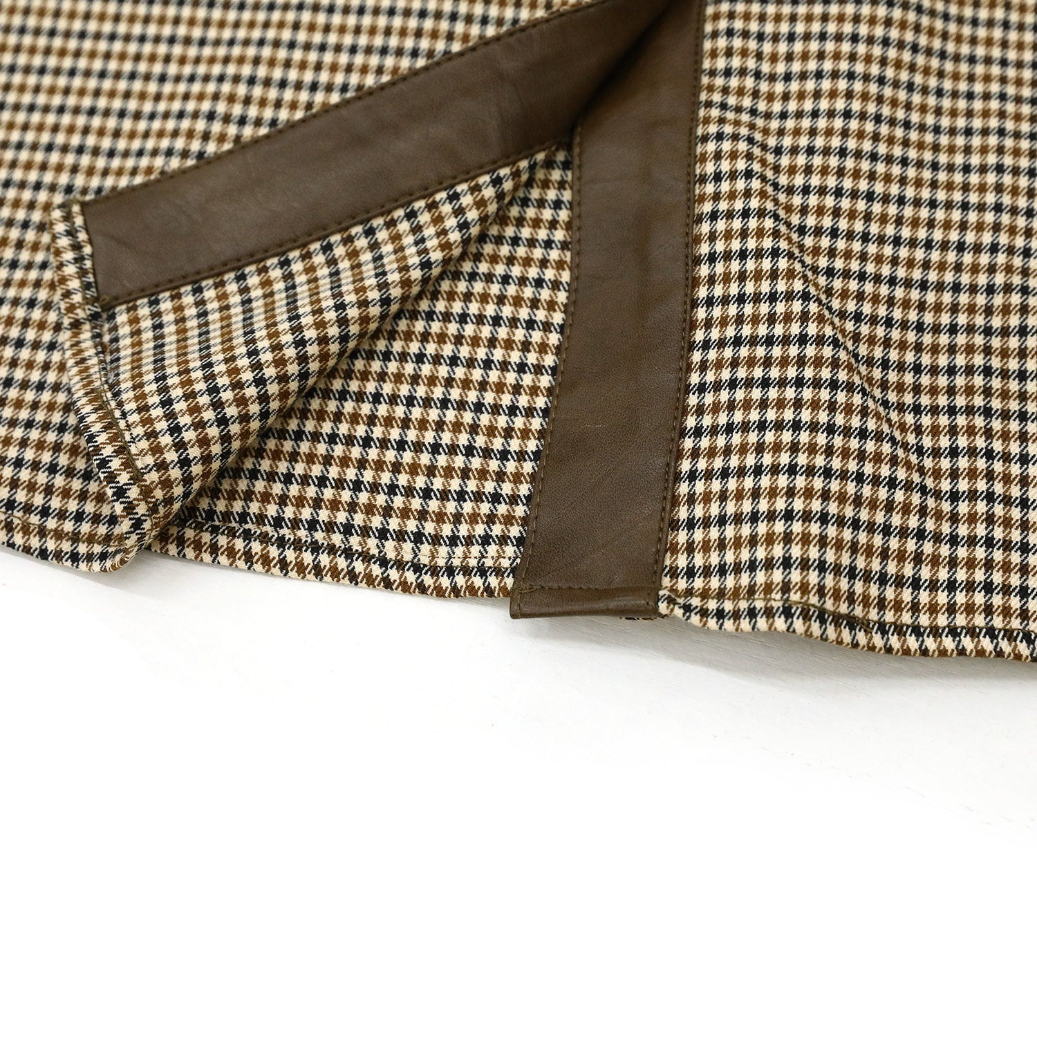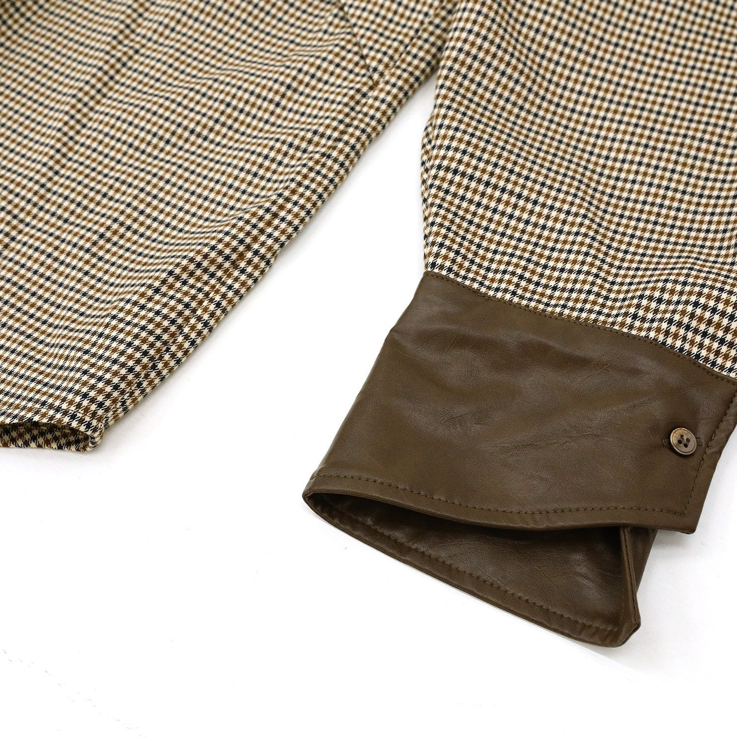 ベースは落ち着いた千鳥格子柄にレザー調素材をポイント使いすることで、トラッドな印象の中にエッジの効いたムードをプラスしています。