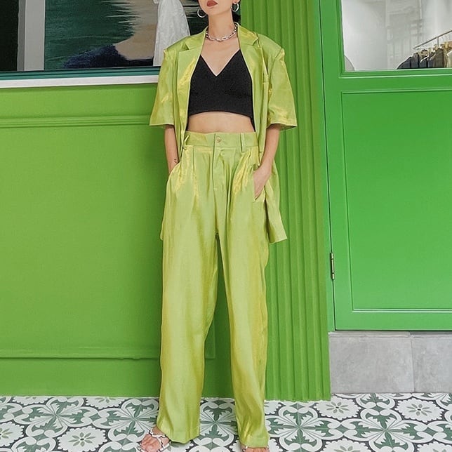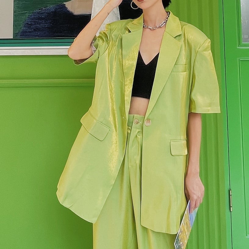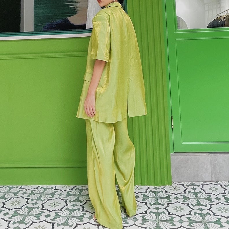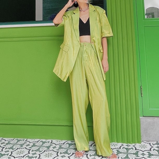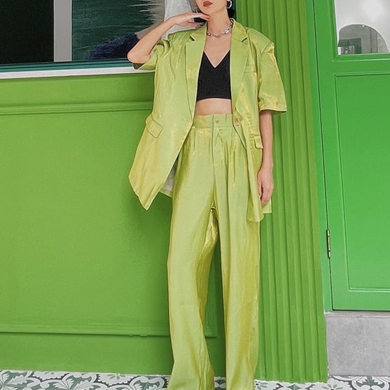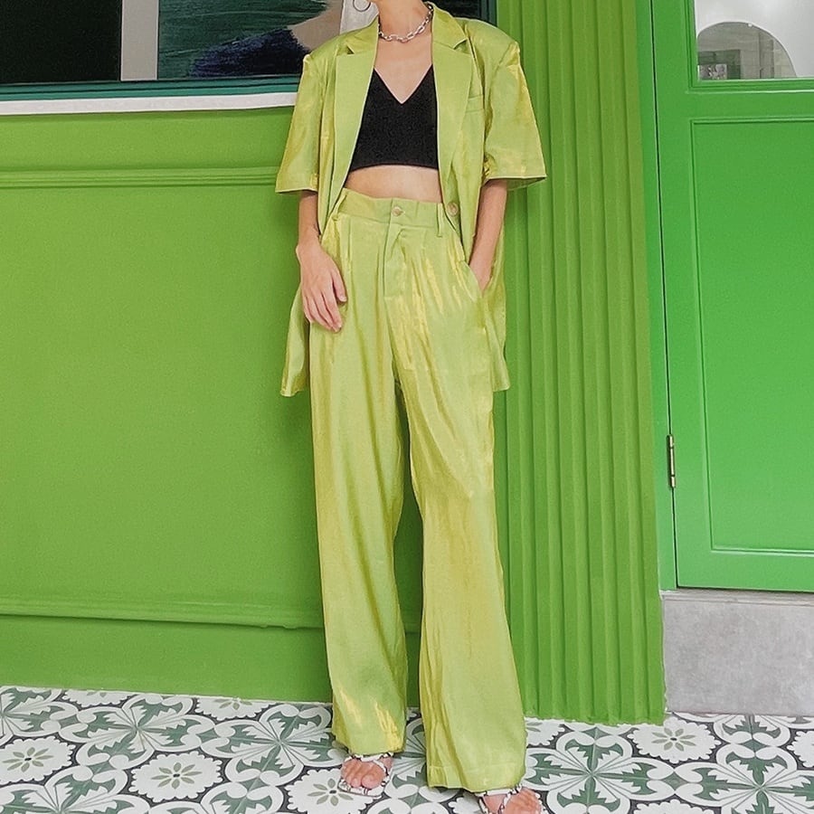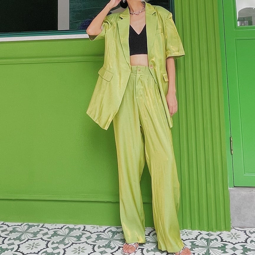 一目で視線を奪う、反光感のあるグリーンで強さと抜けを両立させた主役セットアップ。