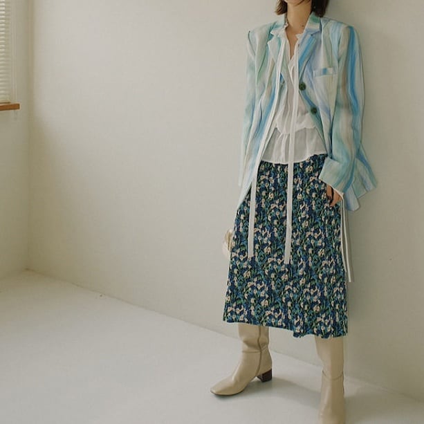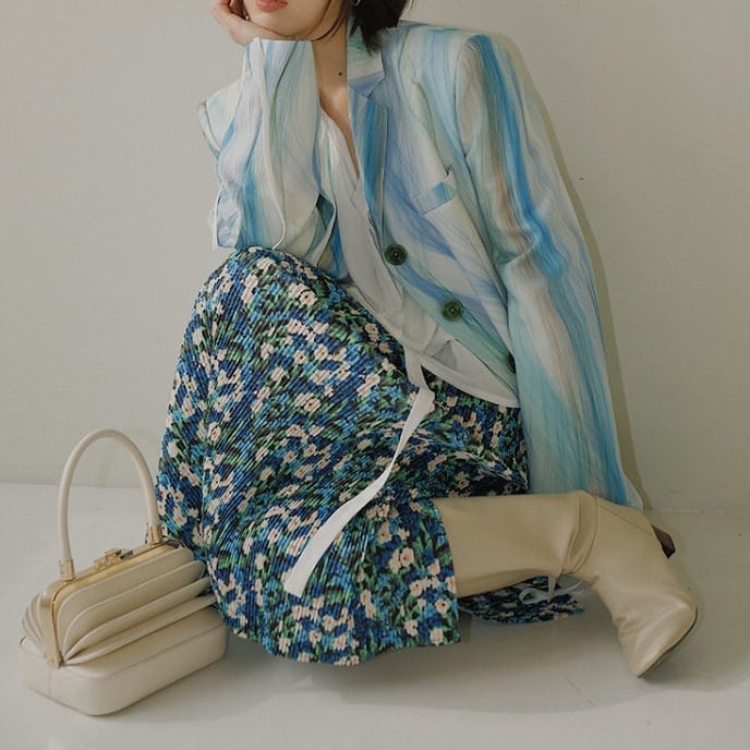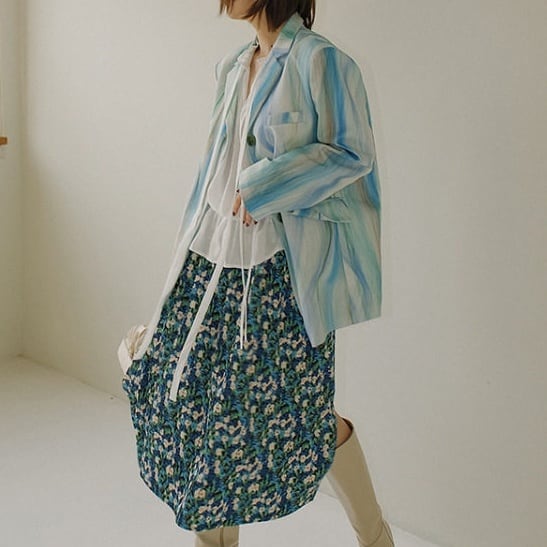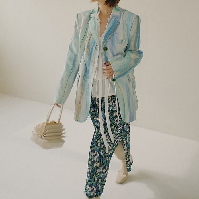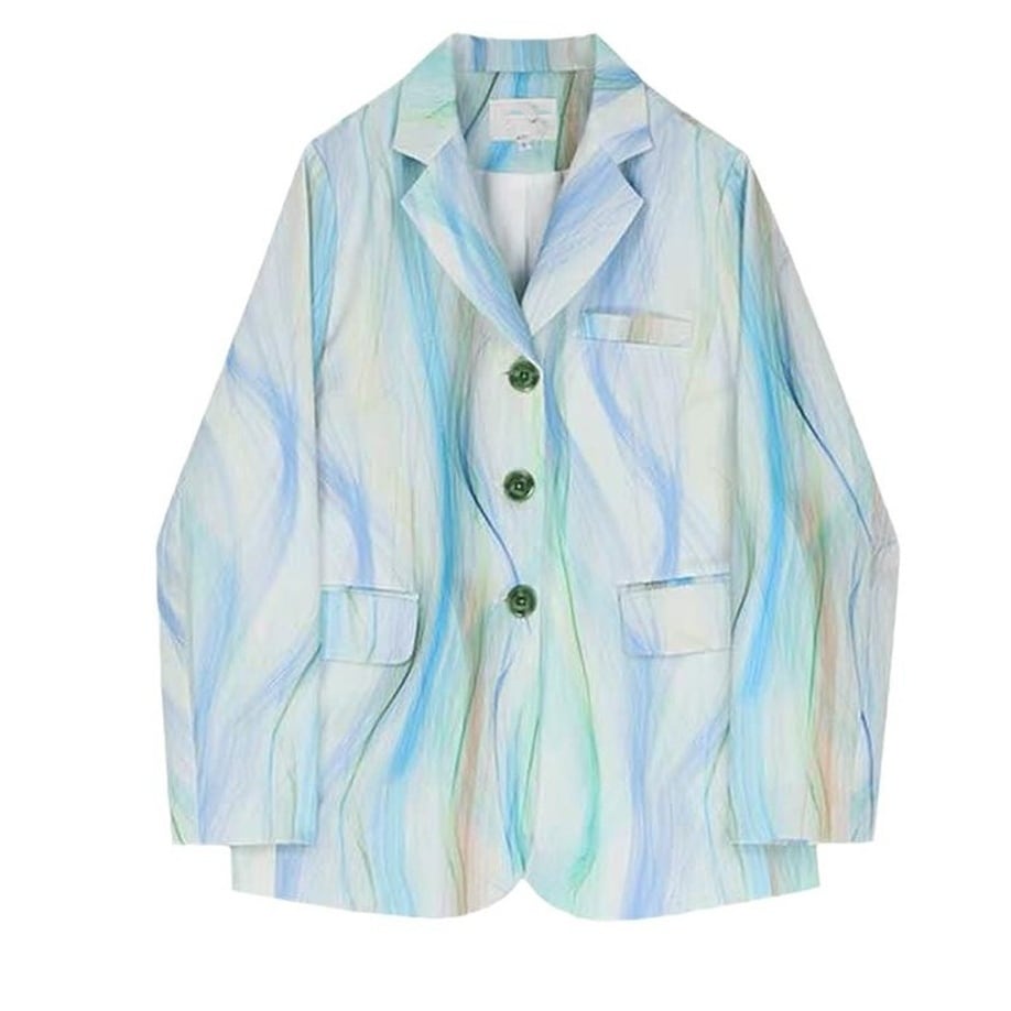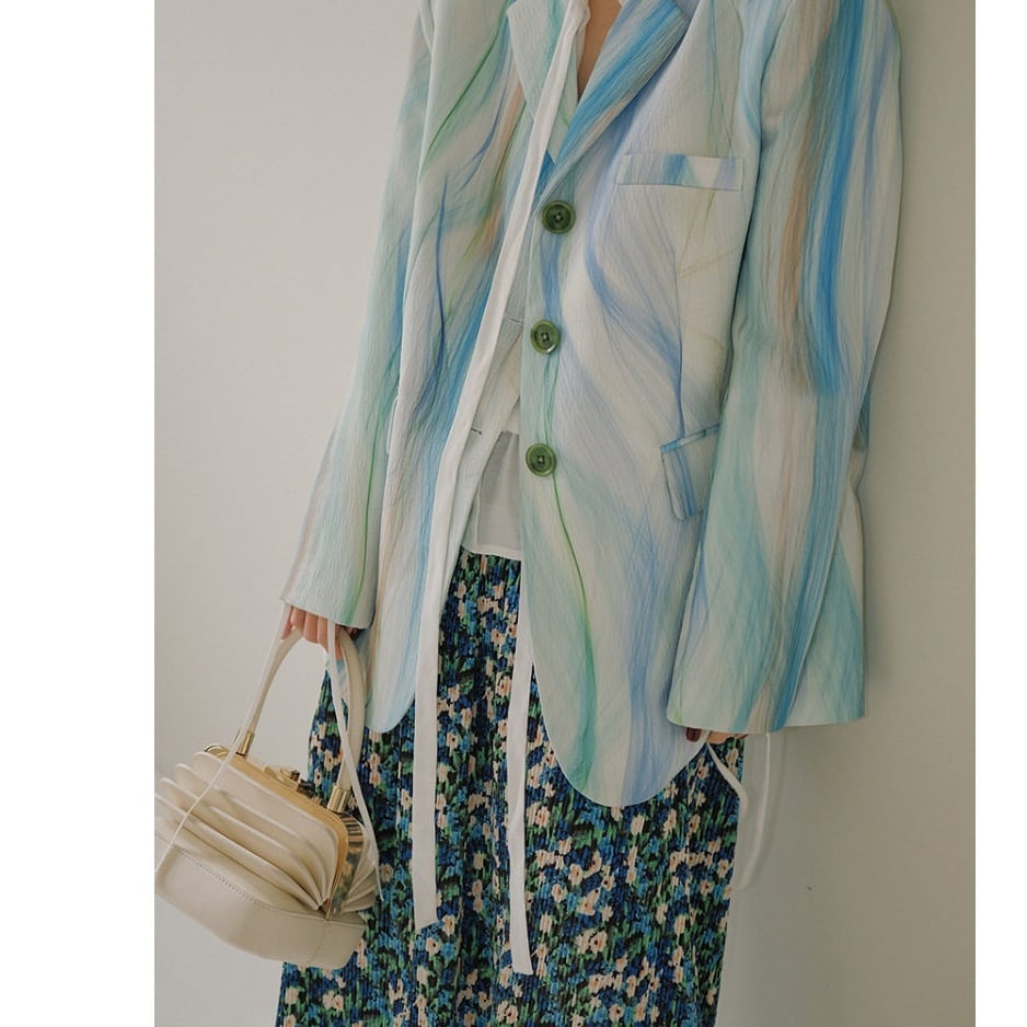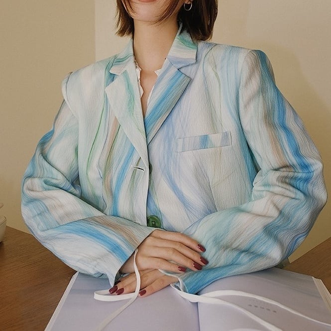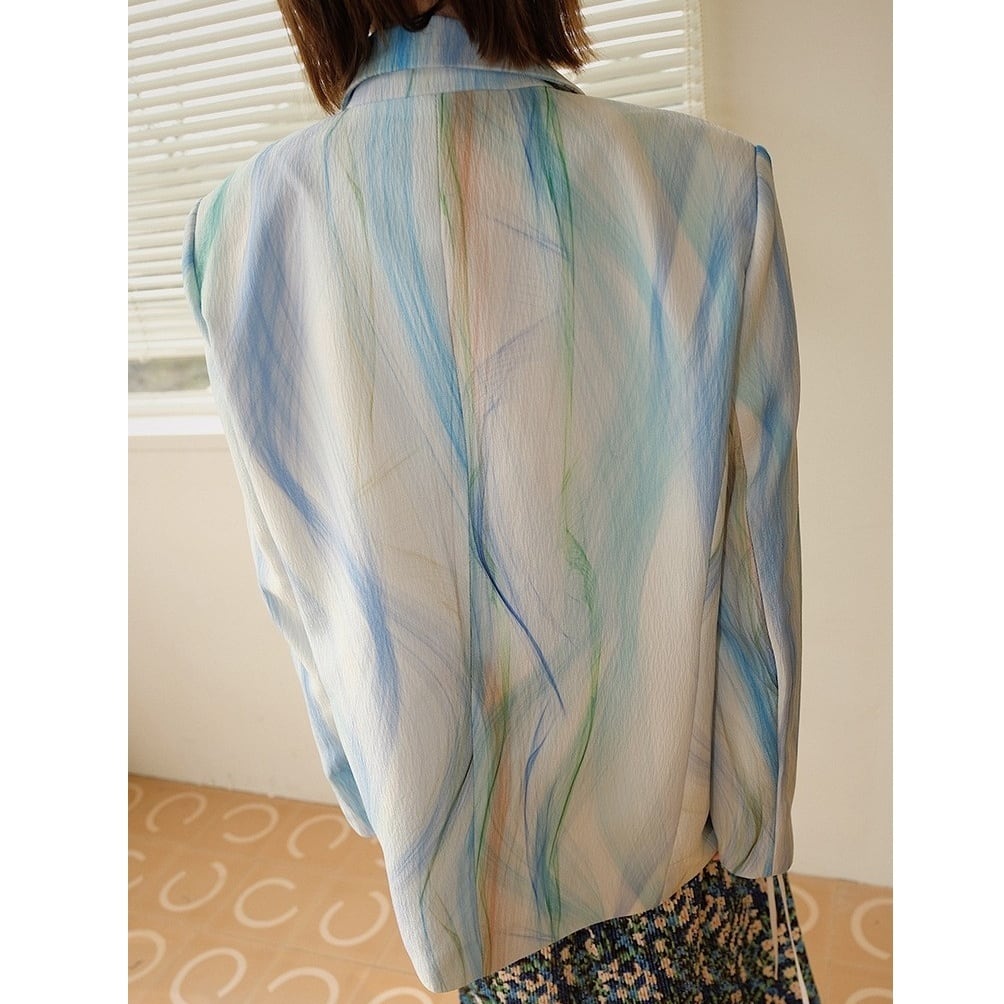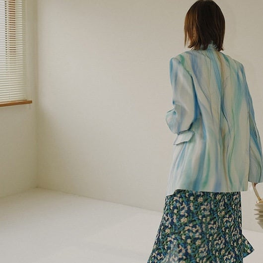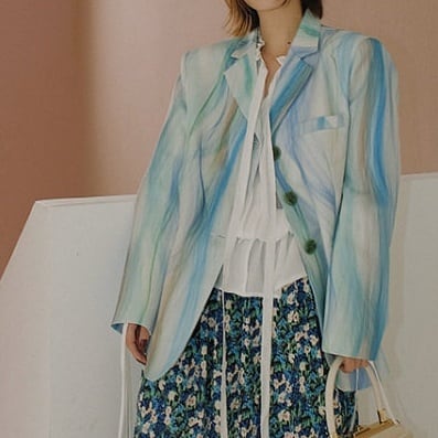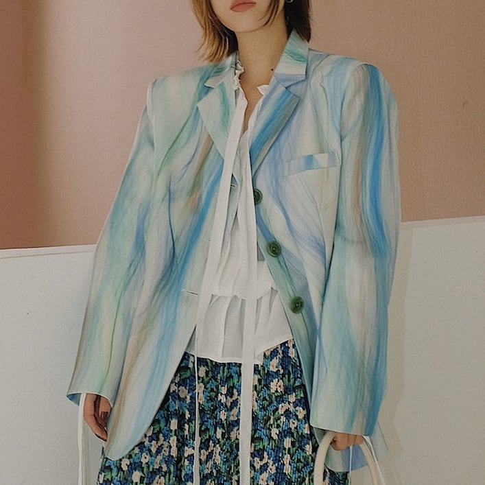 まるでキャンバスに絵の具を落としたような、淡くにじむブルーとグリーンのグラデーション。油絵のような色彩表現が印象的な、アート感覚のテーラードジャケット。