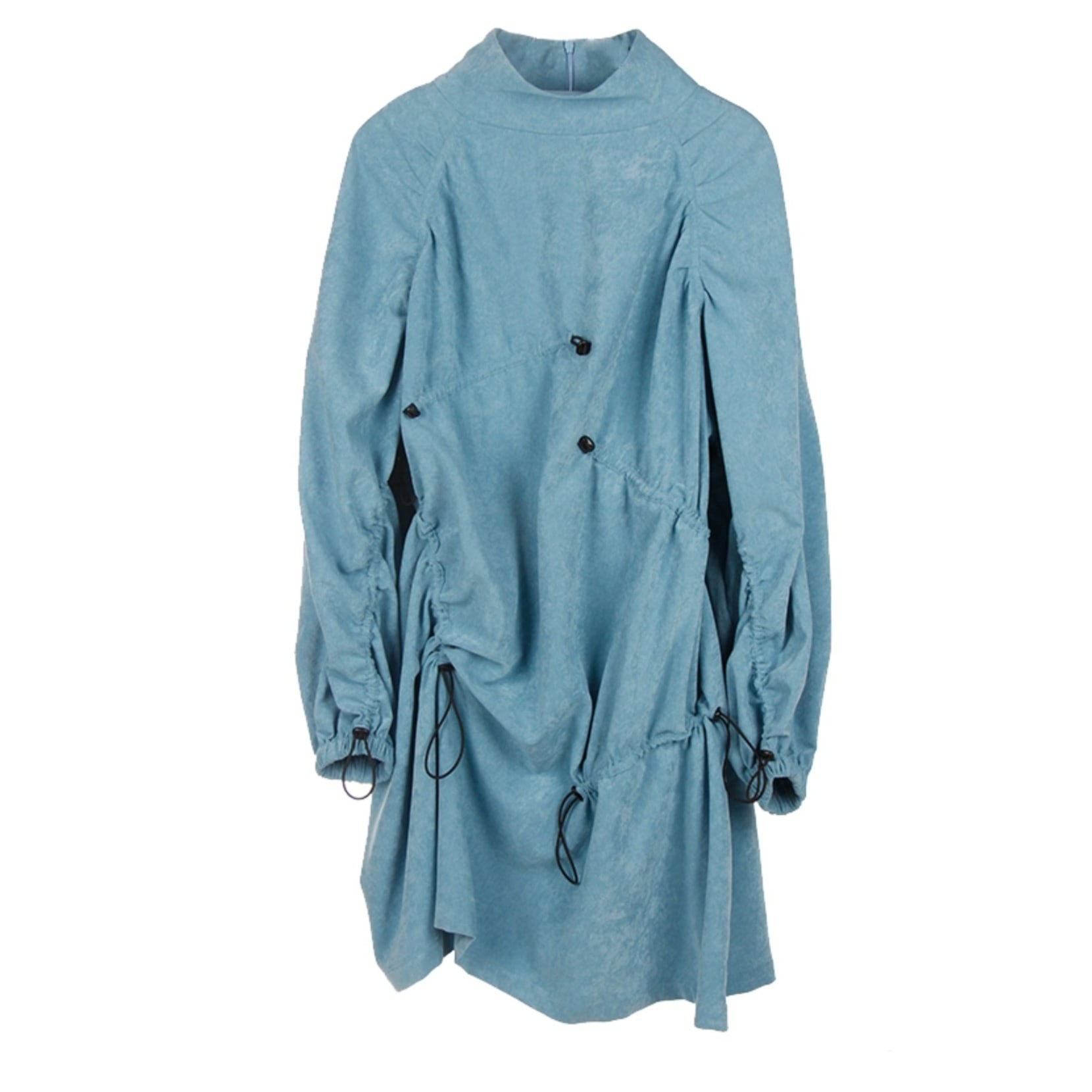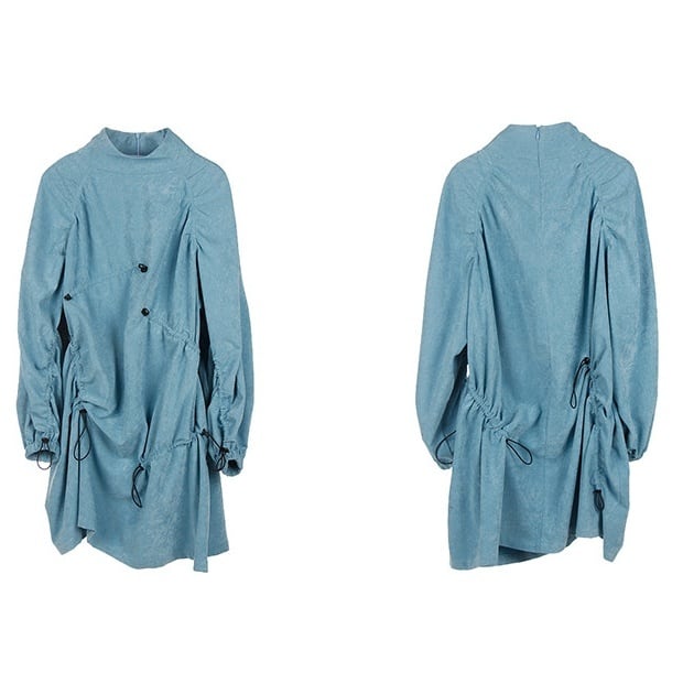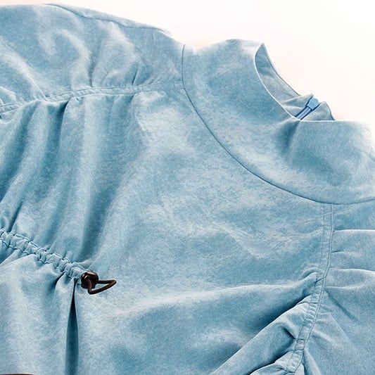 ウエストやサイドに配置された複数のドローコードは、絞り具合によってAライン・コクーン・アシンメトリーと表情を変えられるのが最大の魅力。