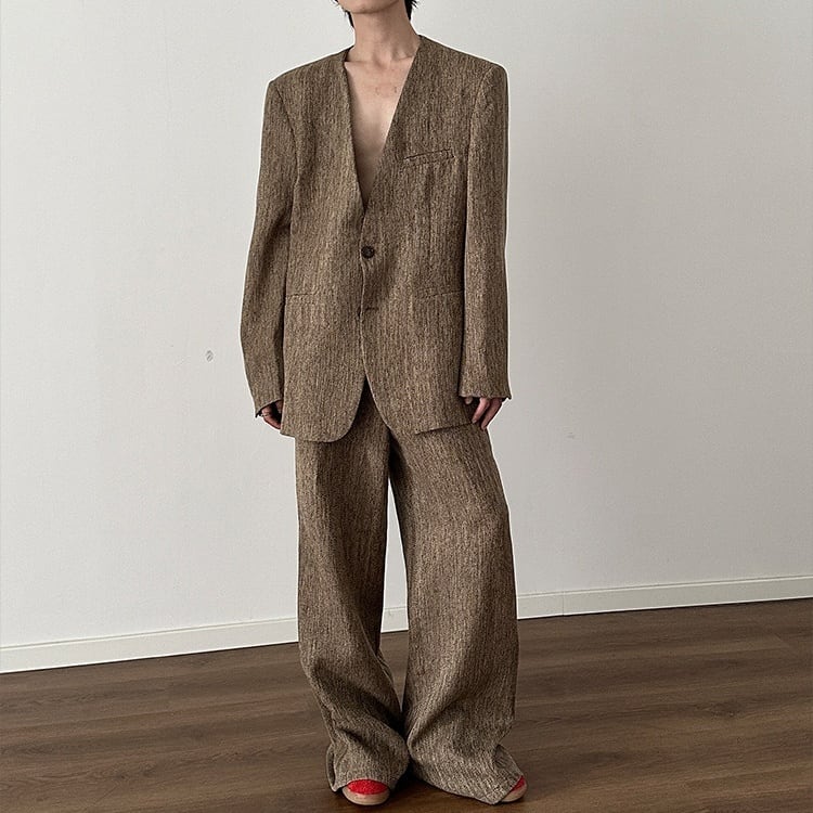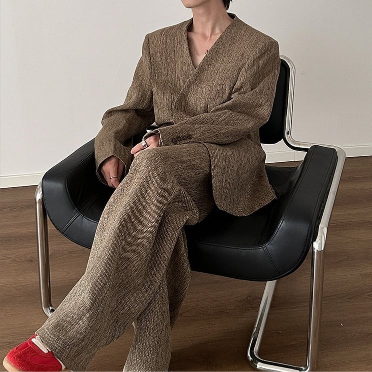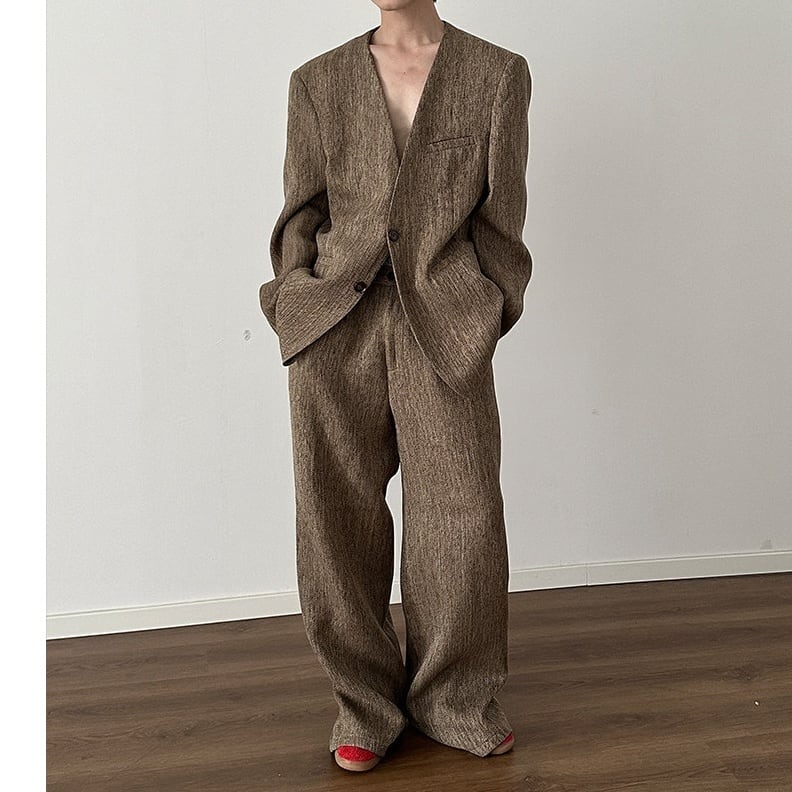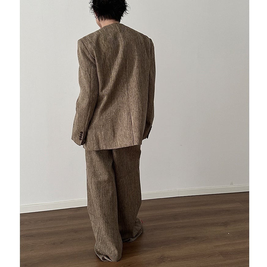 ラフさと色気を同時に纏える、ノーカラージャケット×ワイドパンツの メンズセットアップ。