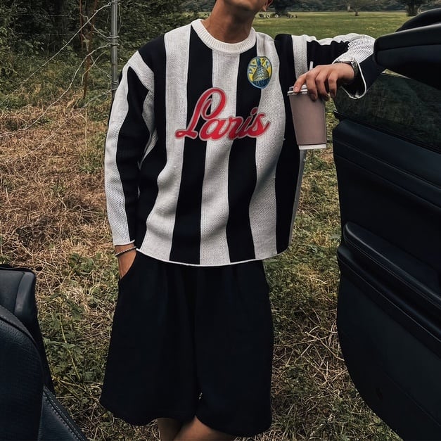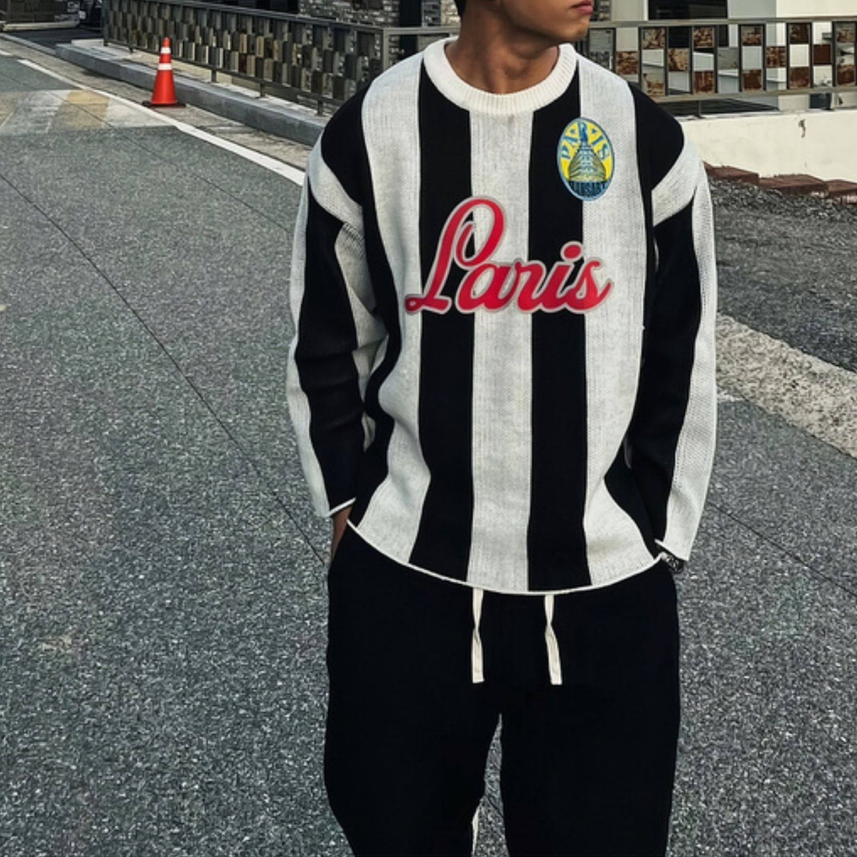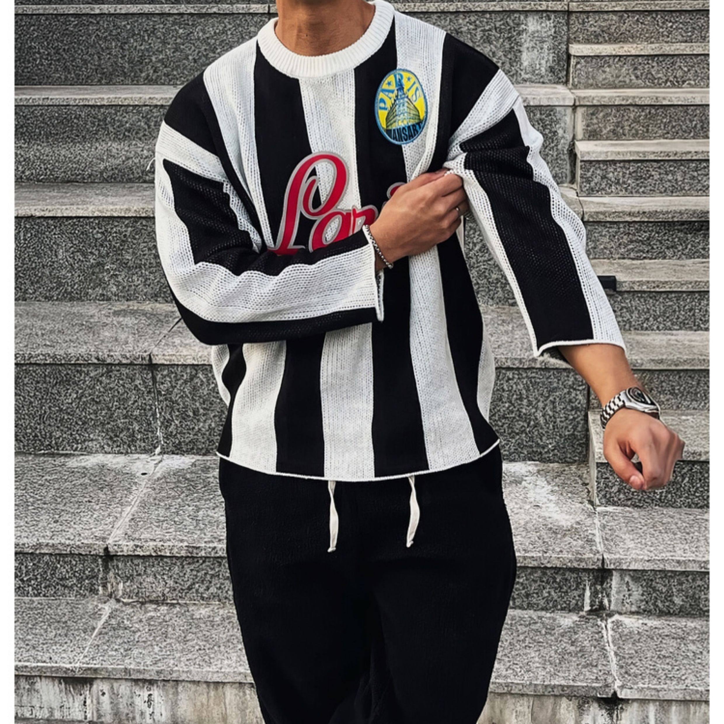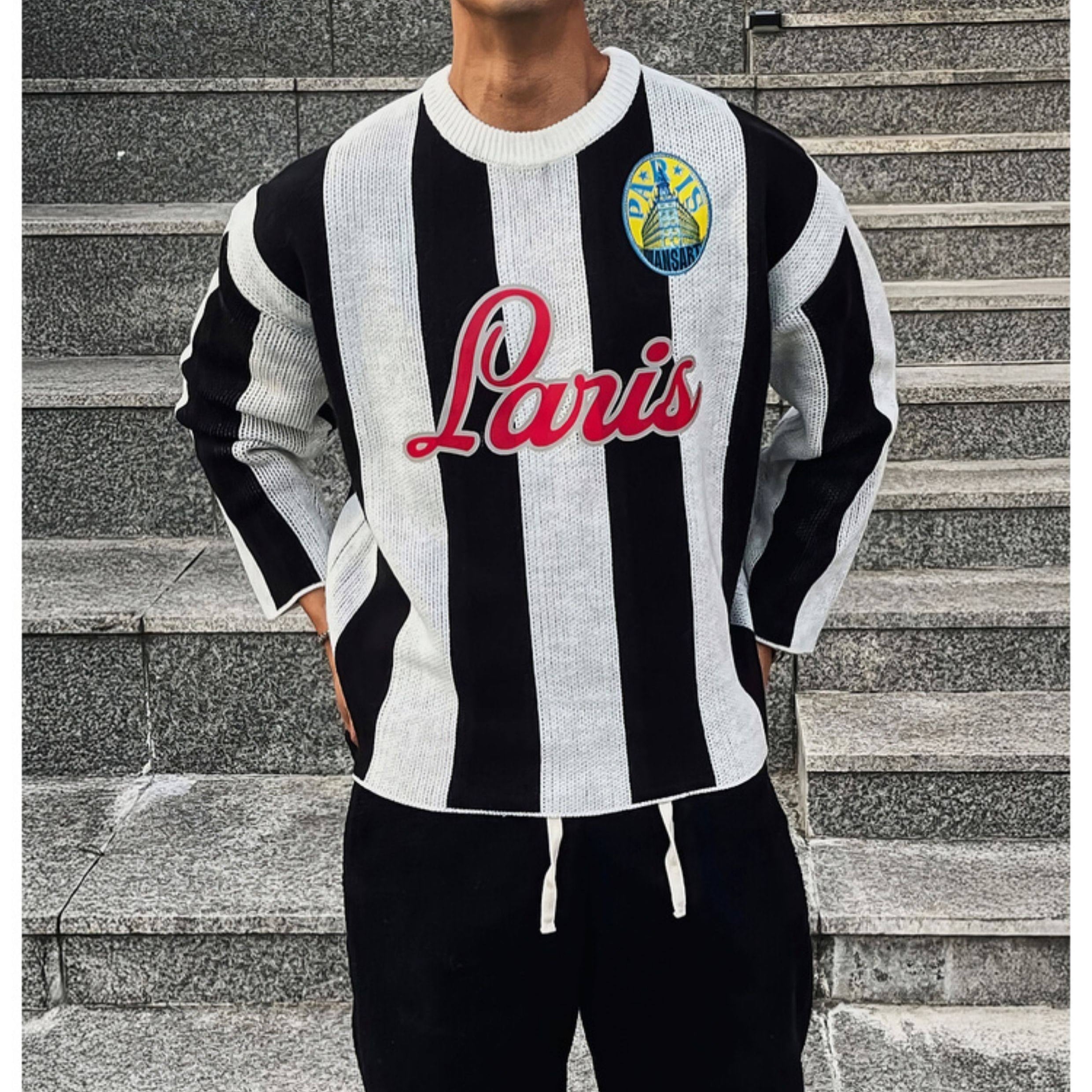 クラシックなブラック×ホワイトのストライプに、ヴィンテージライクなロゴデザインを落とし込んだレトロムード漂うニットプルオーバー。