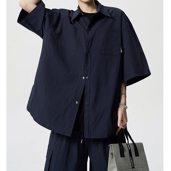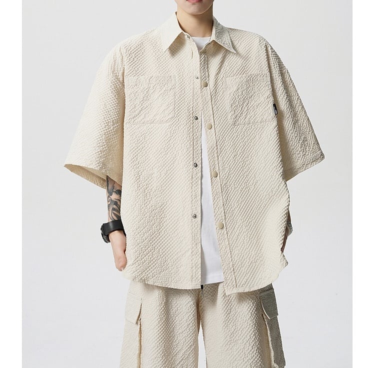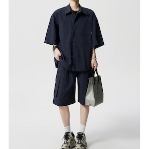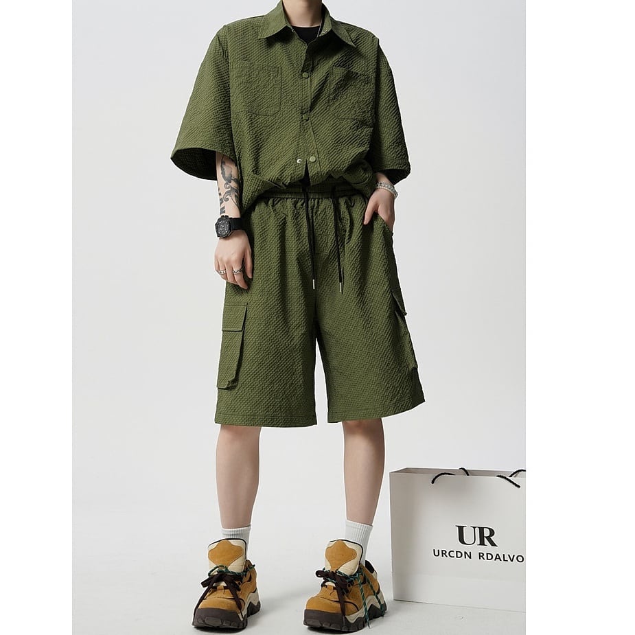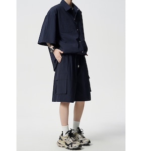 シルエットは全体的にゆとりを持たせたリラックスフィット。身体のラインを拾いにくく、一日中着てもストレスを感じにくい設計です。トップスはシンプルな半袖シャツデザインで、単品使いもしやすいバランス感。ボトムスは程よい丈感のショーツで、セットアップとしてはもちろん、Tシャツやタンクトップと合わせた着回しも楽しめます。