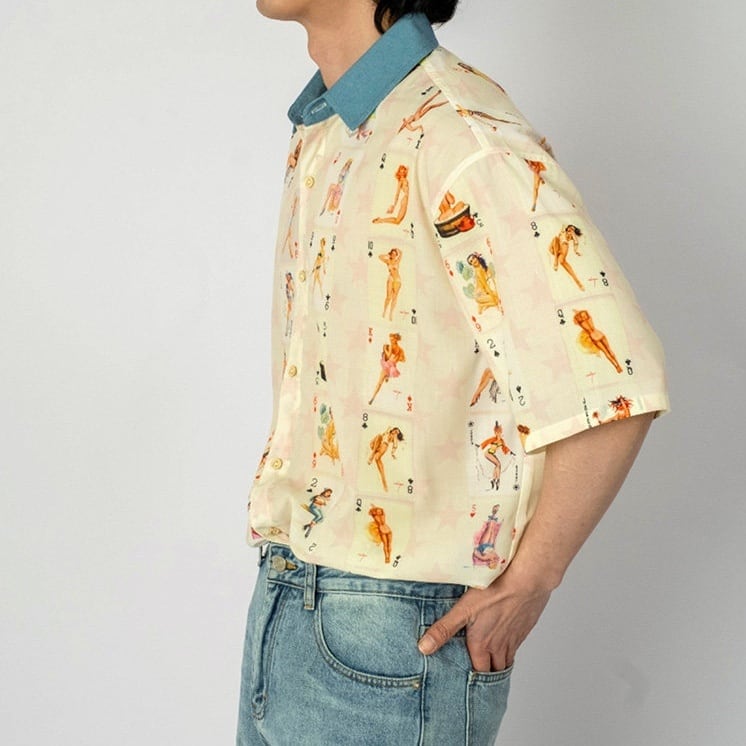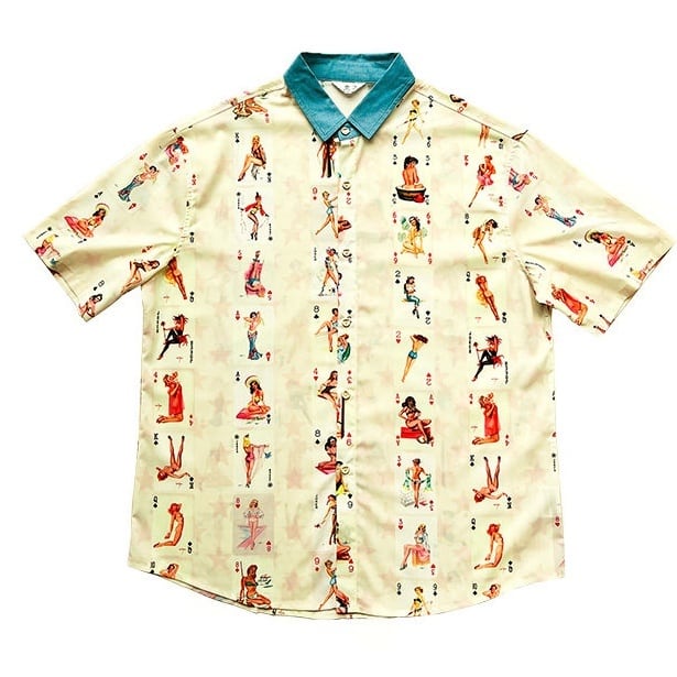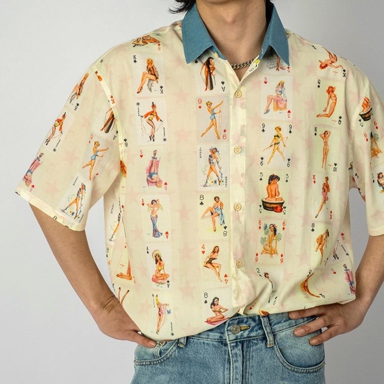 どこか懐かしくて、でも今っぽい。ポーカーモチーフの総柄を落とし込んだハワイアンシャツ。ヴィンテージトランプを思わせるイラストを全体に散りばめ、遊び心のあるデザインに仕上げました。一枚でしっかり存在感がありながら色味を抑えているため派手すぎず、大人でも取り入れやすいバランスです。