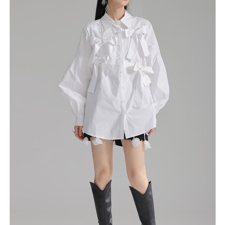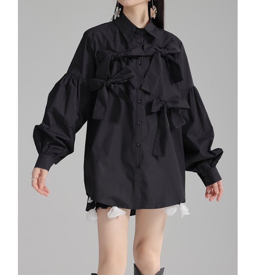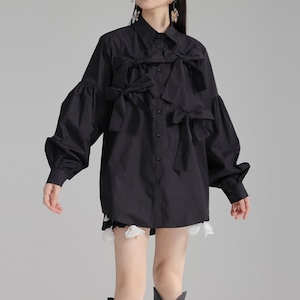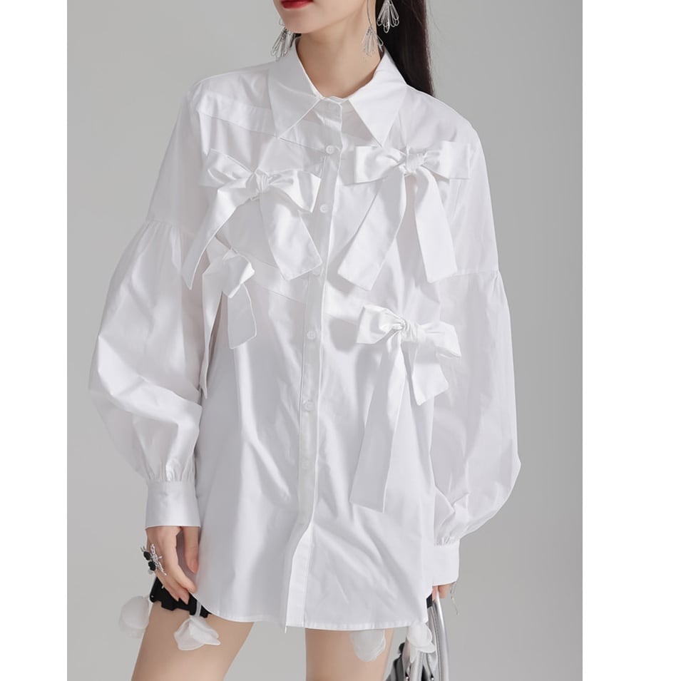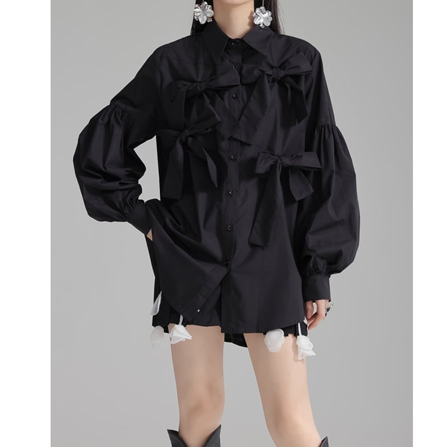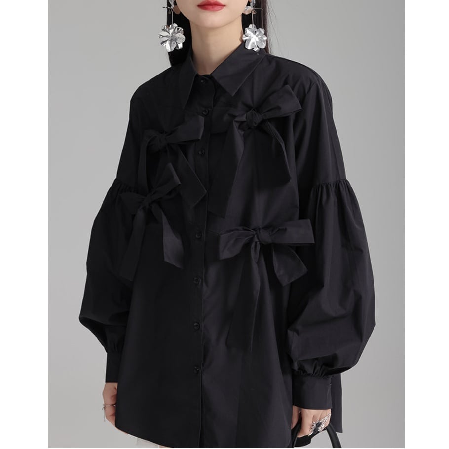 立体的にあしらわれた リボンディテール が目を引く、エレガントさとモード感を兼ね備えたデザインブラウス。