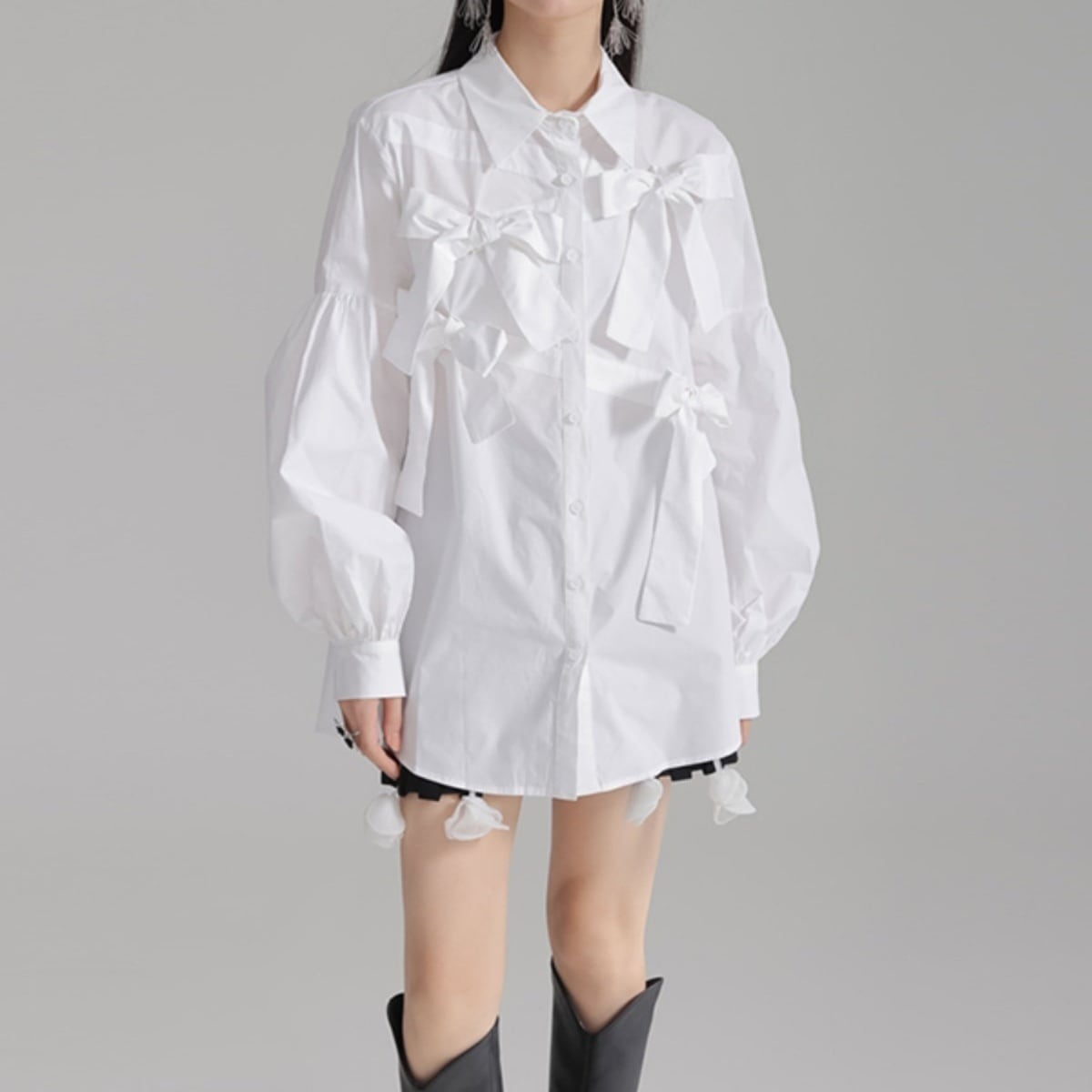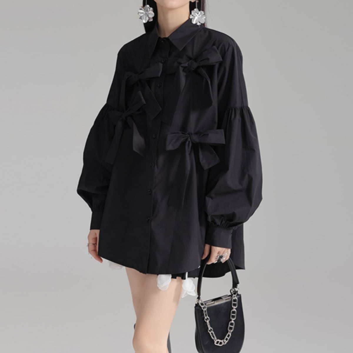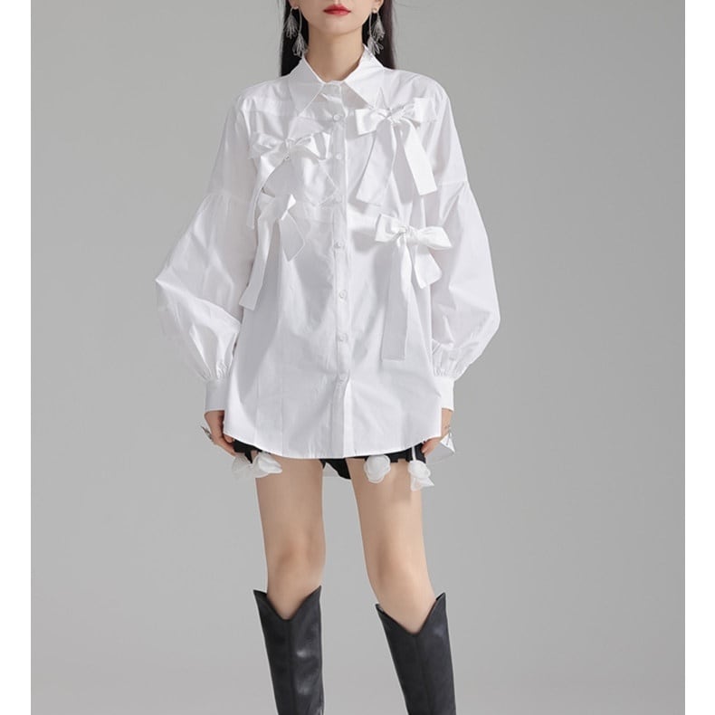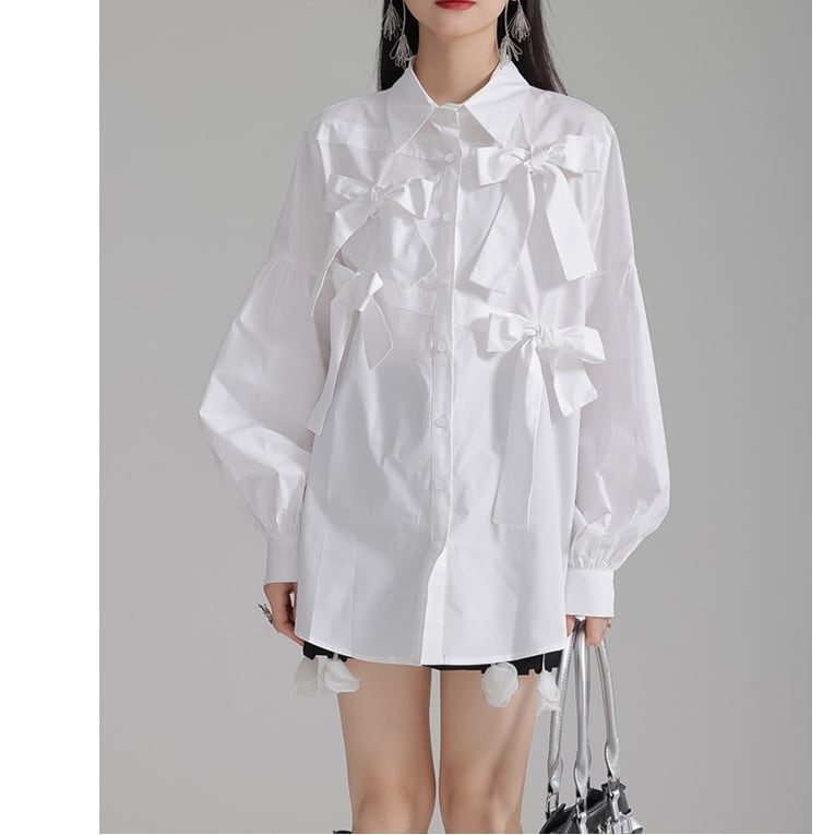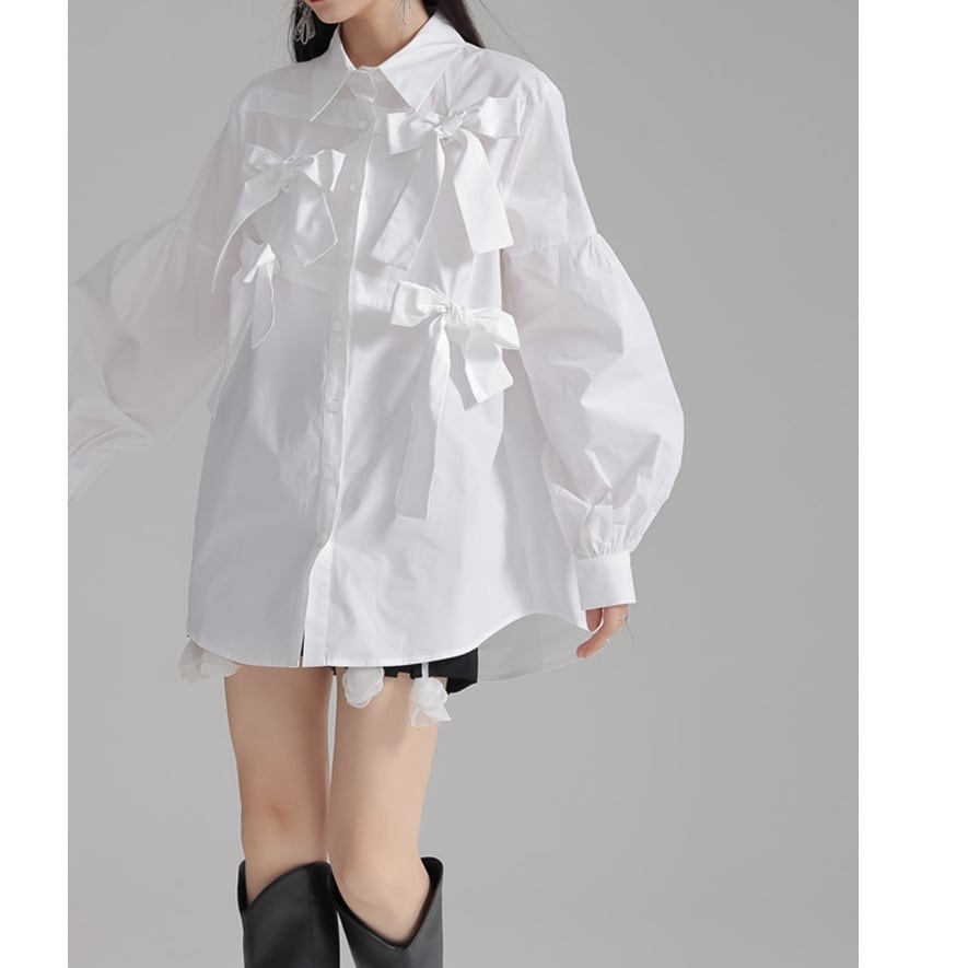 立体的にあしらわれた リボンディテール が目を引く、エレガントさとモード感を兼ね備えたデザインブラウス。