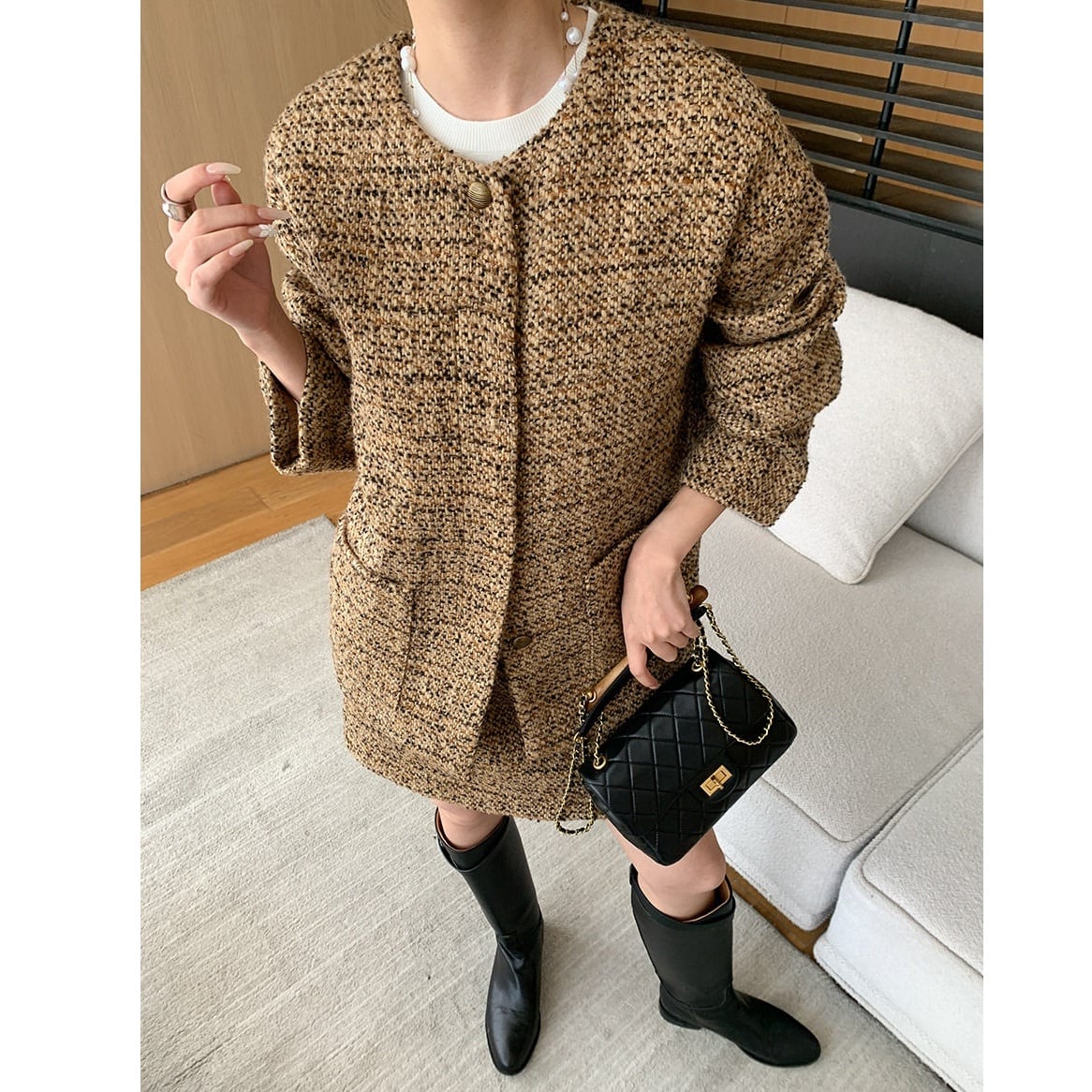 ・セットアップで着用し、ロングブーツを合わせてクラシックに