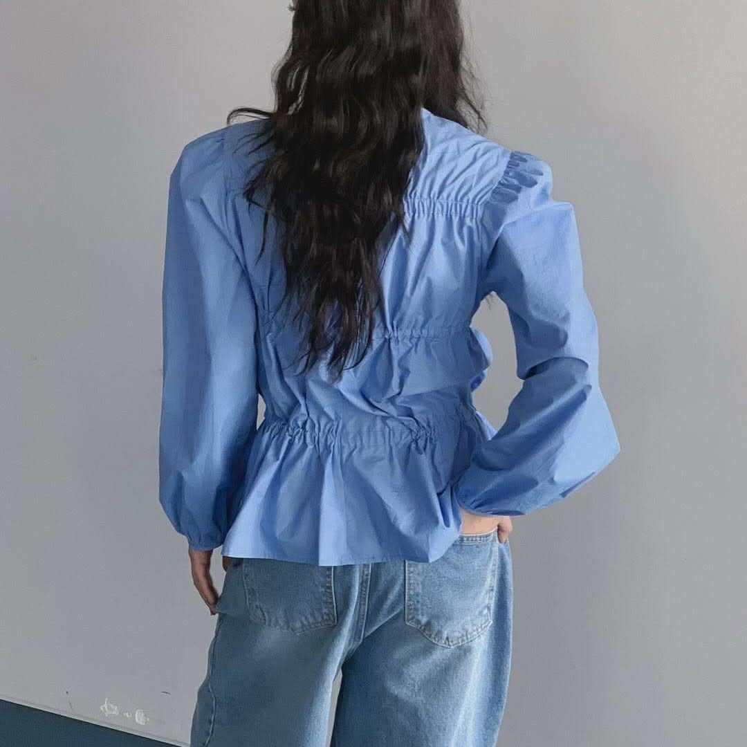 ウエストの抽褶デザインが目を引く、小众デザイン感たっぷりのブラウス。フロントのリボン×ドローストリング仕様で、甘さの中にモードな雰囲気をプラス。