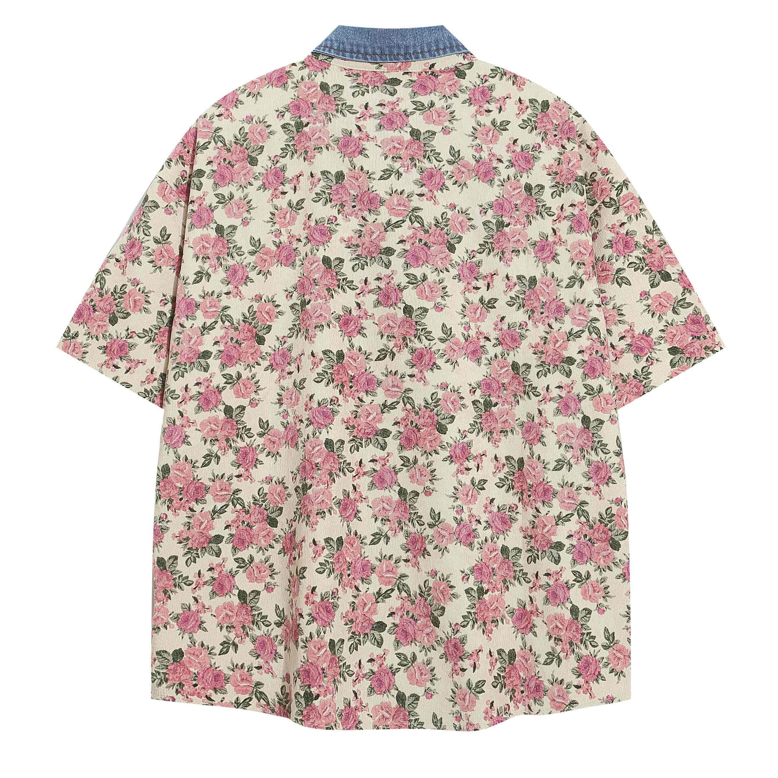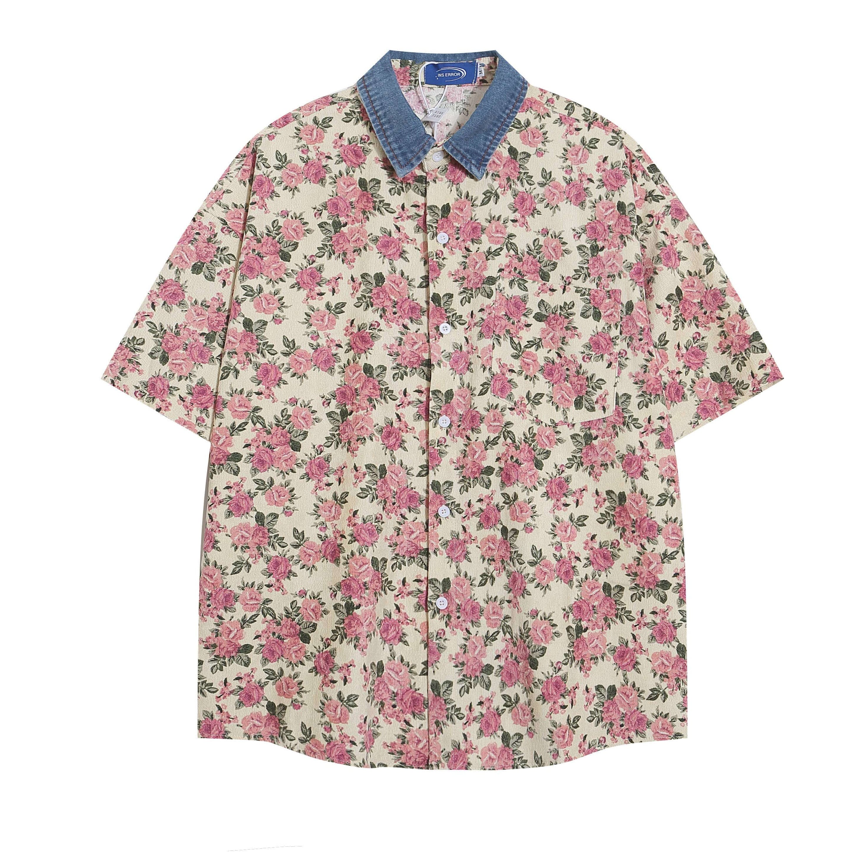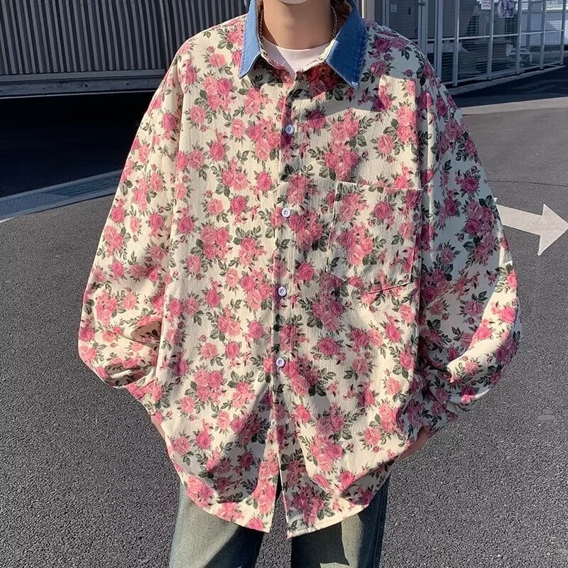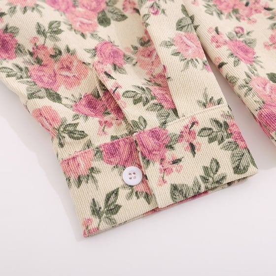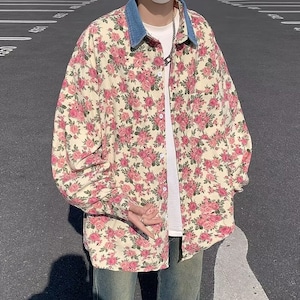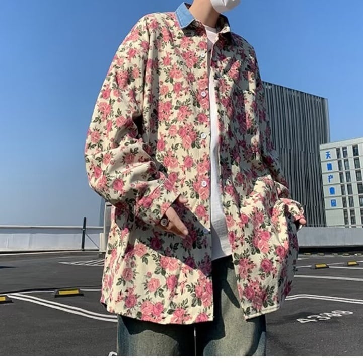 ヴィンテージ感のあるフラワープリントが印象的な、ユニセックス仕様のオーバーサイズシャツアウター