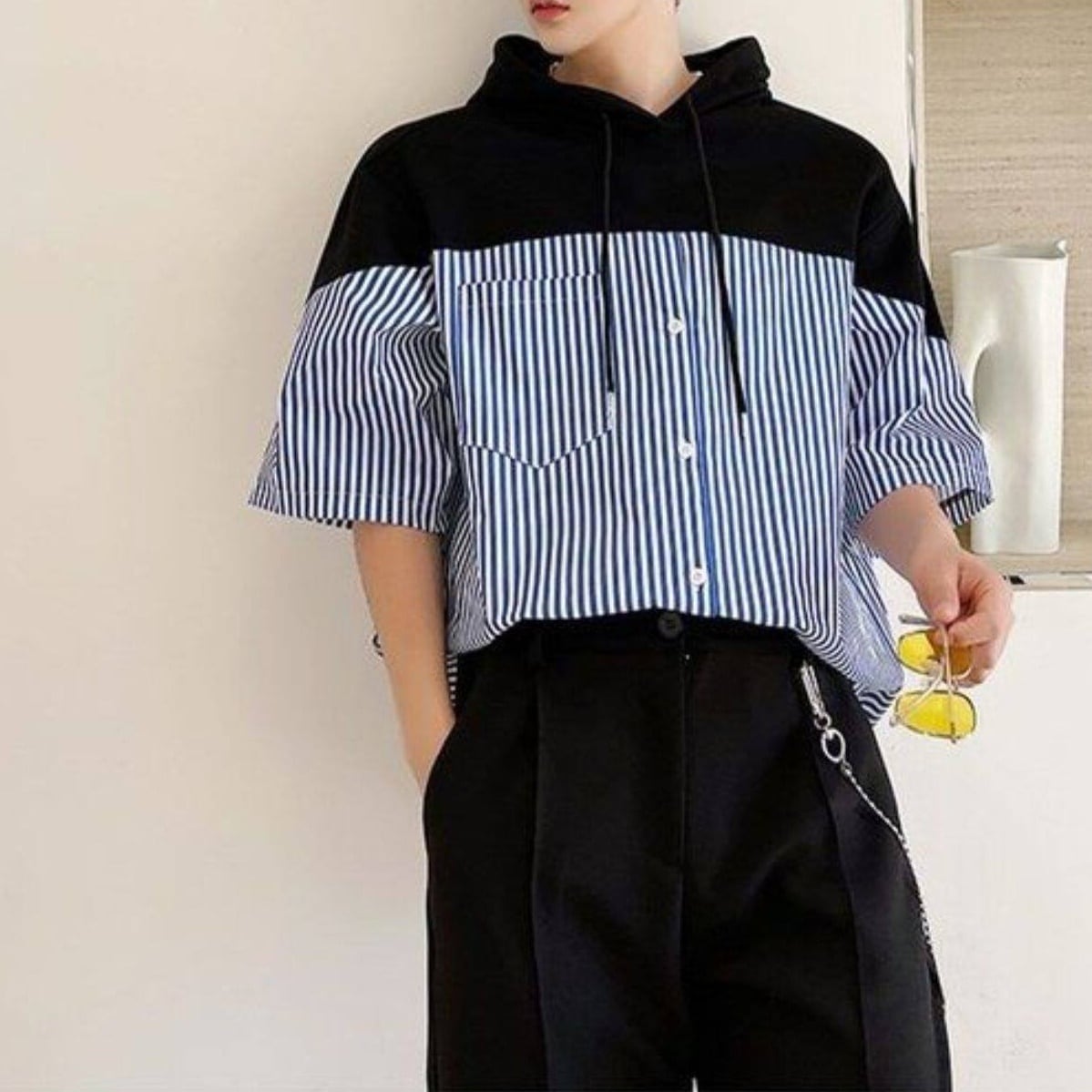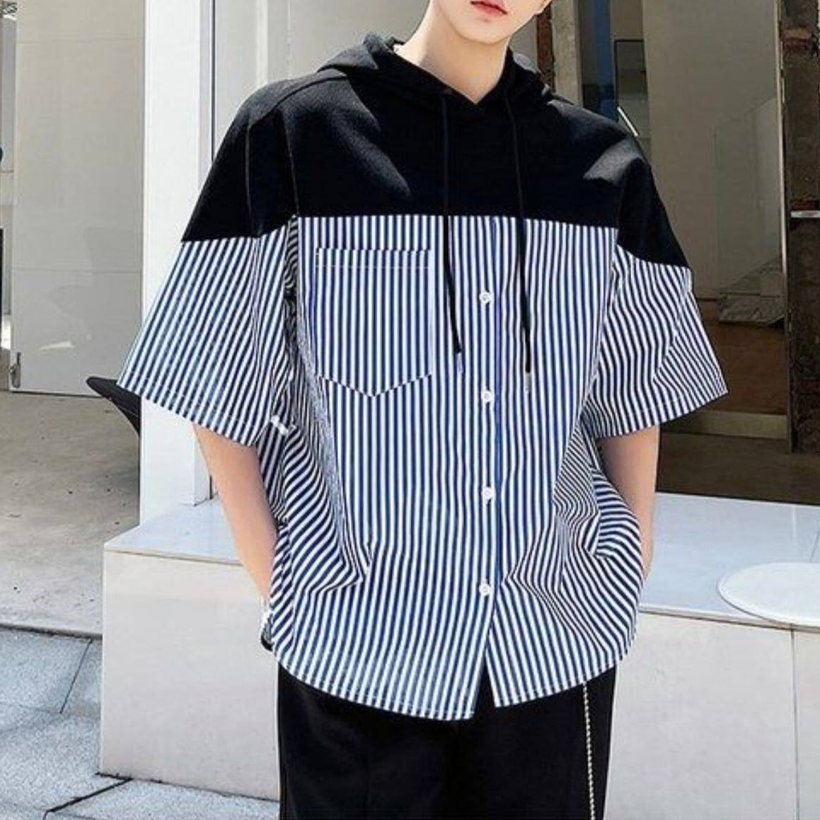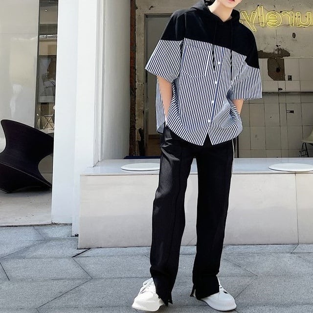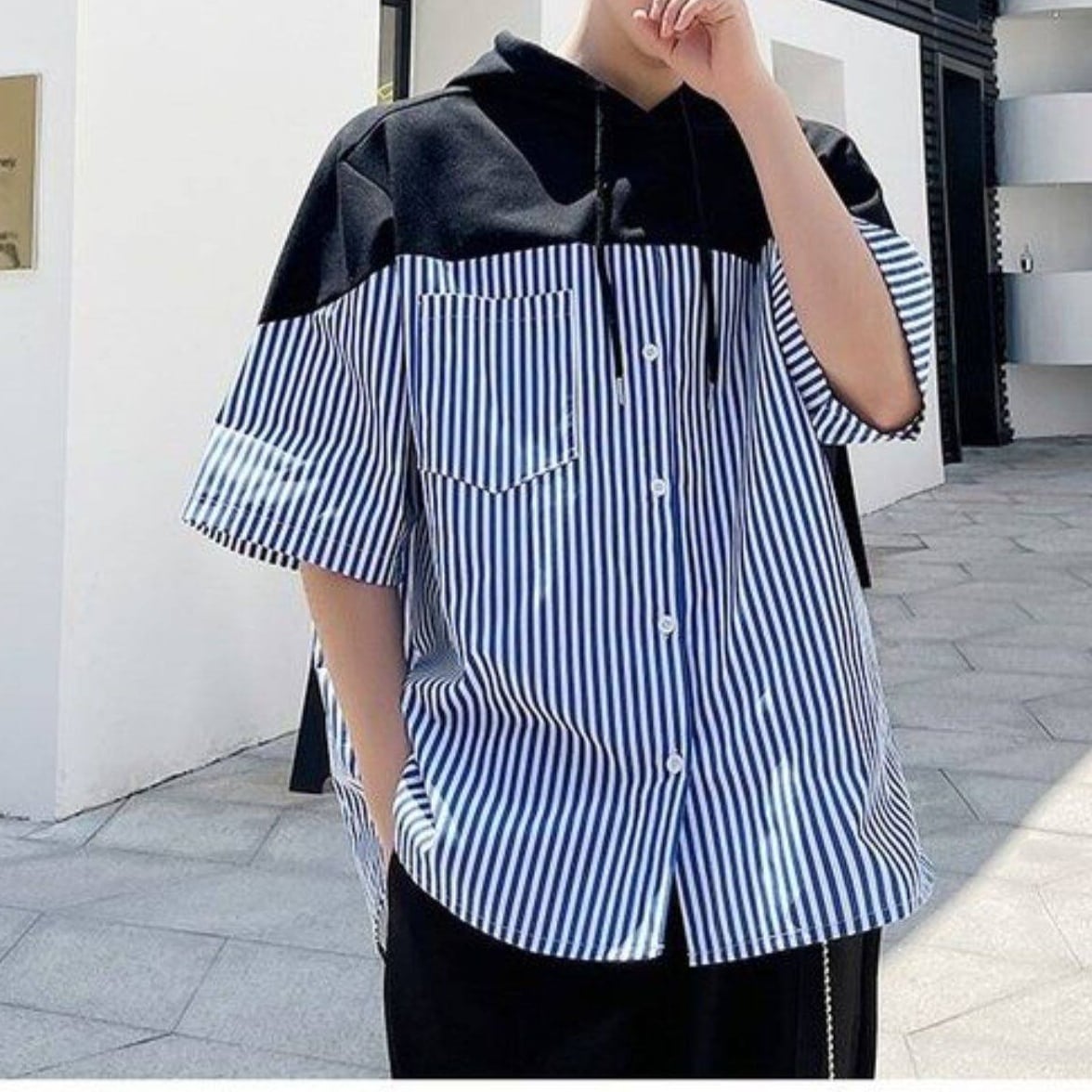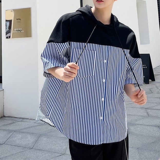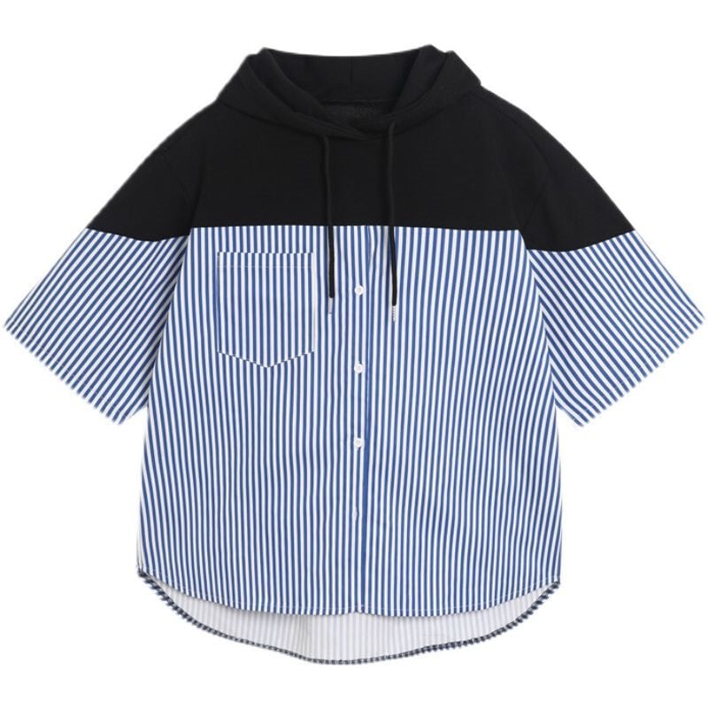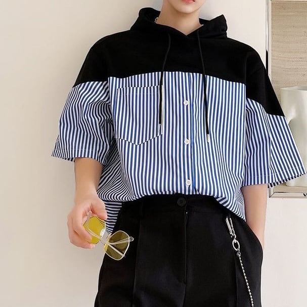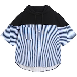 フード付きデザインが目を引く、ストライプ切り替えショートスリーブシャツ。