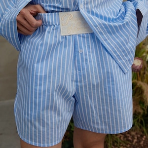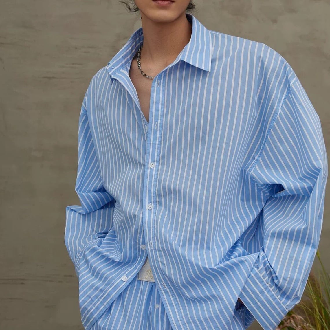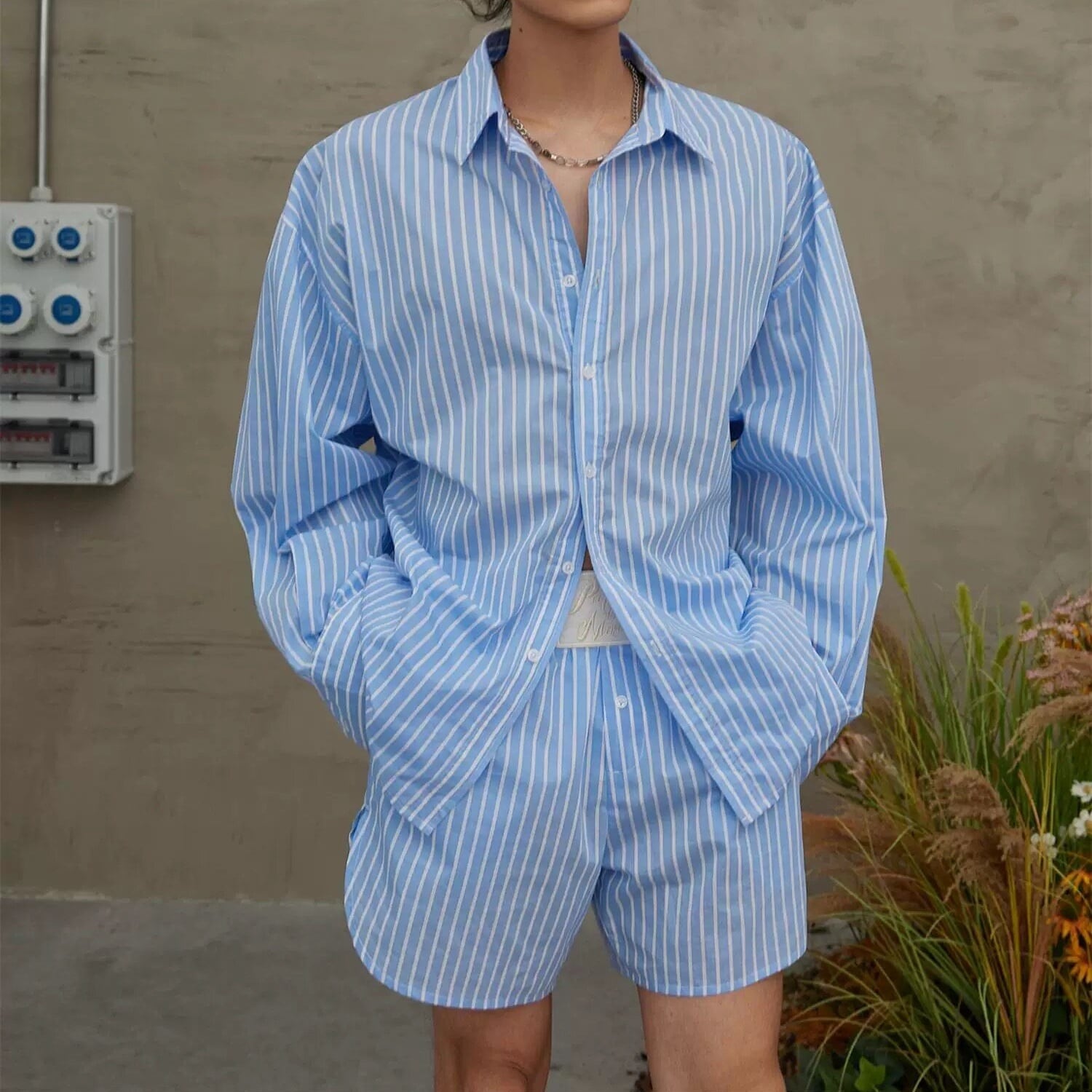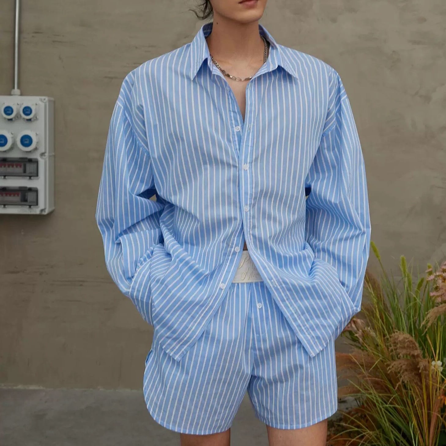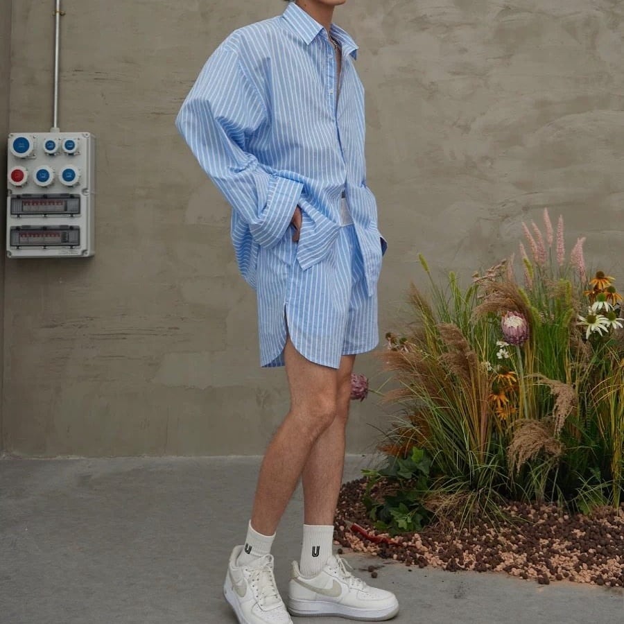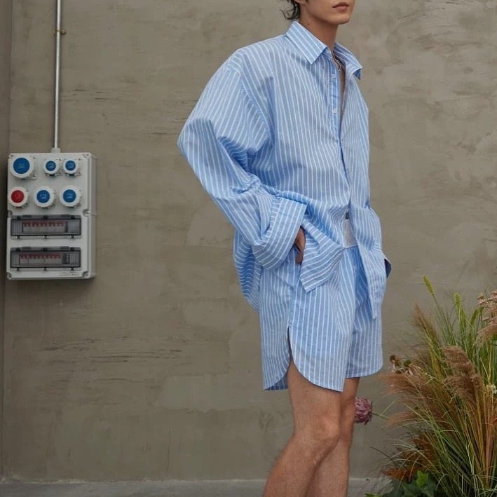 爽やかなブルーストライプが印象的な、リラックス感たっぷりのシャツ&ショーツセットアップ。程よくゆとりのあるシルエットで、かっちりしすぎず、抜け感のある大人カジュアルを演出します。シャツは軽く羽織れる長袖デザイン、ショーツはウエストゴム仕様でストレスフリーな穿き心地。