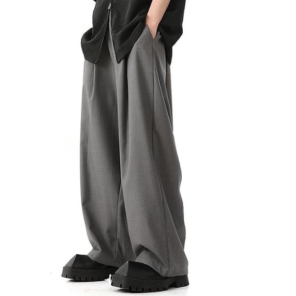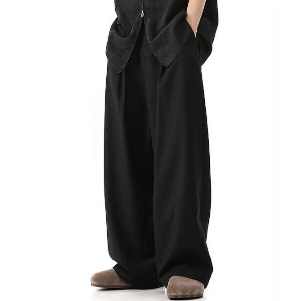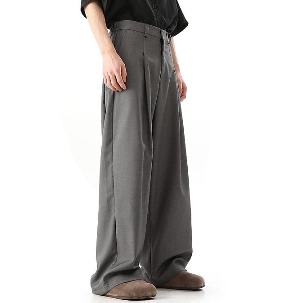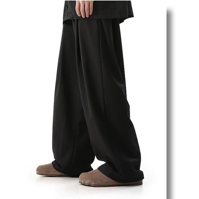 センタープレスが縦ラインを強調しボリュームがありながらも野暮ったくならないシルエット設計で、歩くたびに揺れるドレープが上品で、モードにもストリートにも振れる万能バランス。