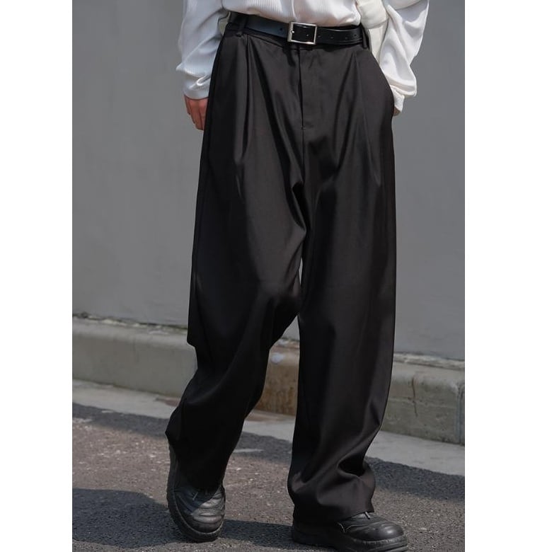 滑らかな光沢と、重みのあるドレープが生み出す立体感。動くたびに流れるように揺れるワイドシルエットが、シンプルなトップスさえも格上げします。