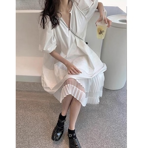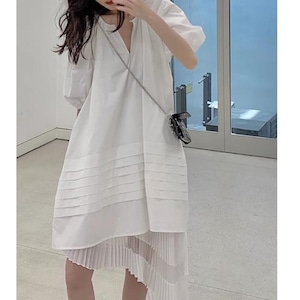 クリーンなホワイトのシャツワンピースに軽やかなプリーツスカートを重ねたフェイクツーピース仕様。アシンメトリーに揺れる裾が歩くたびに空気をまとい、静かな存在感を放ちます。