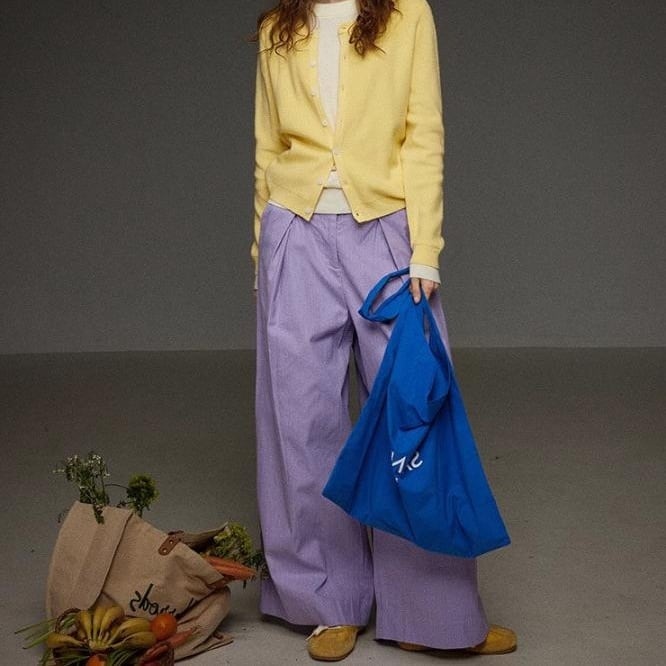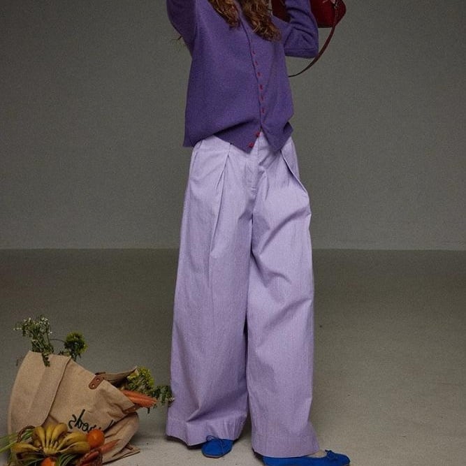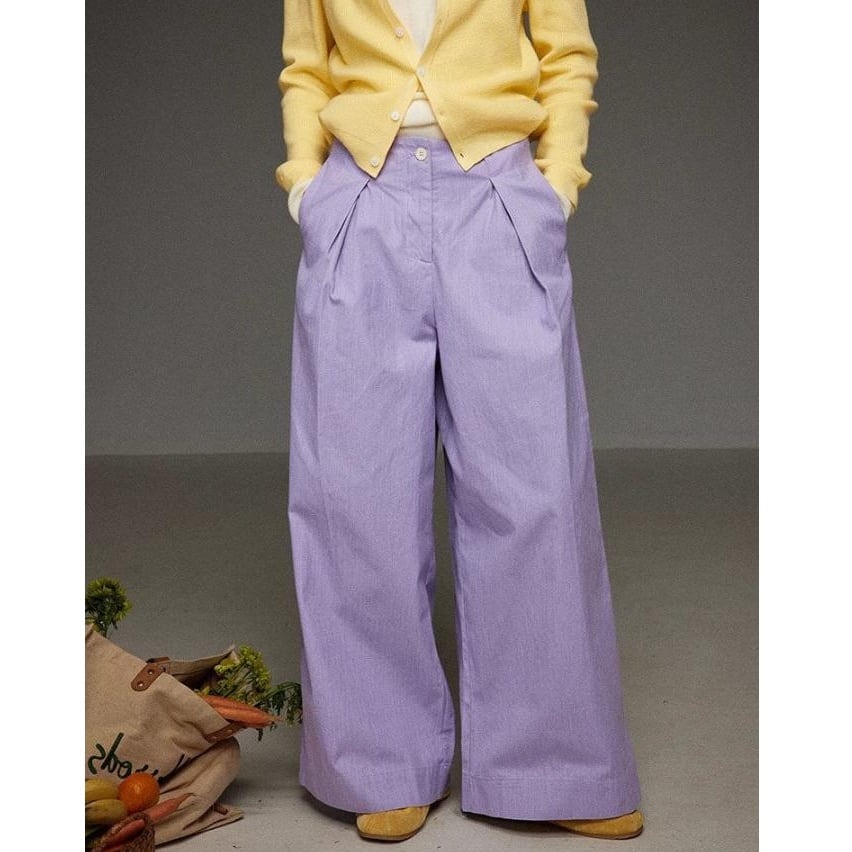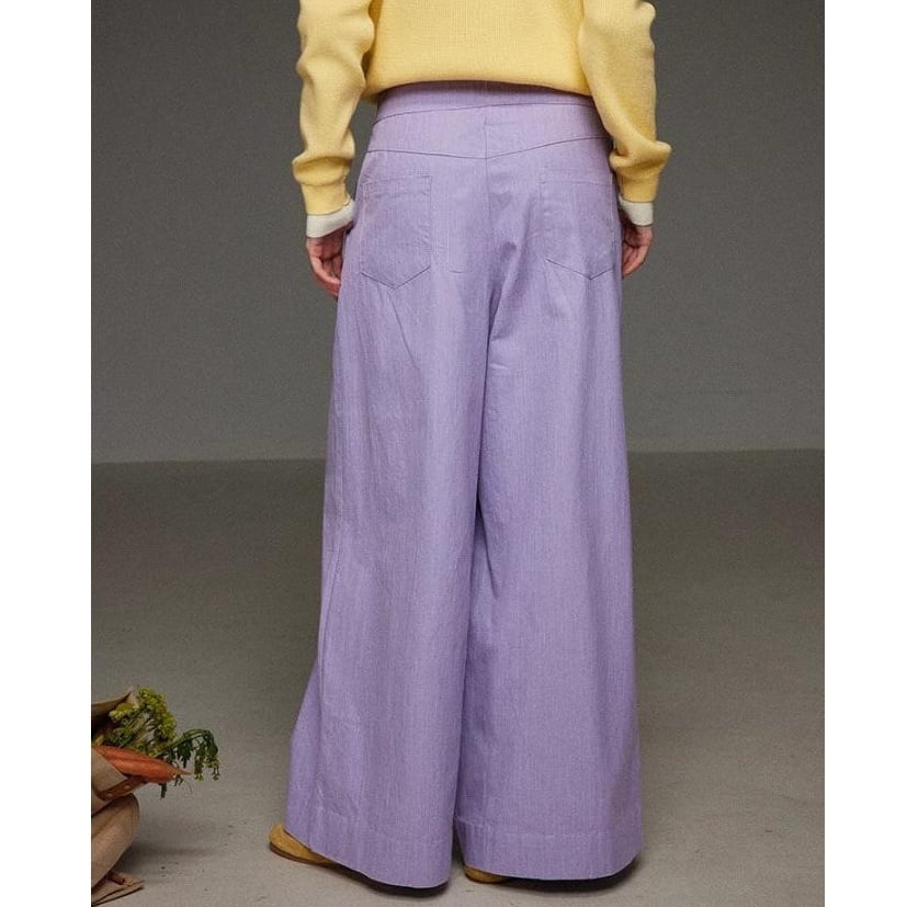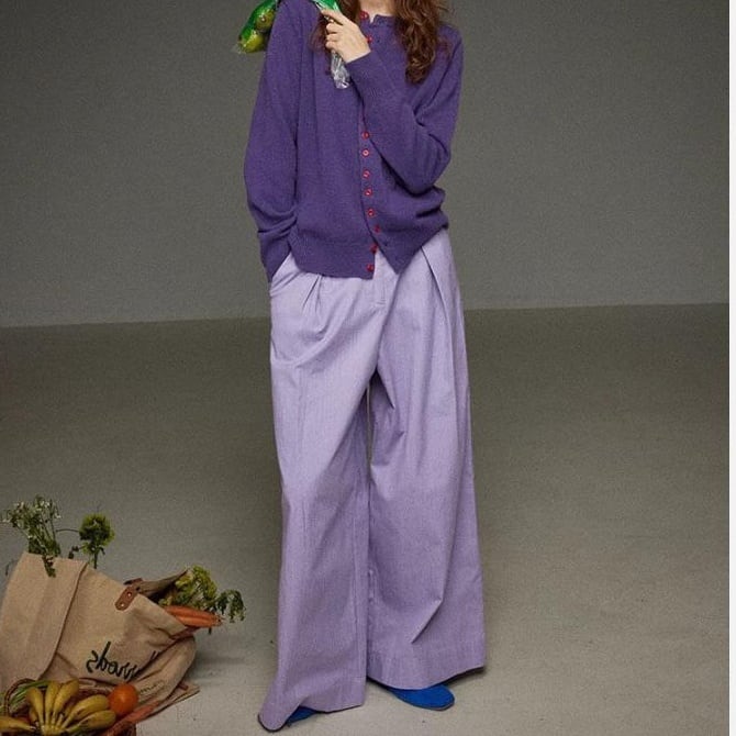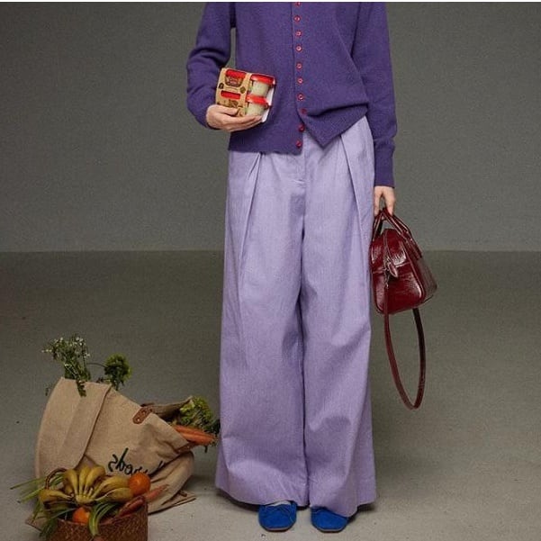 目を引くラベンダーパープルが主役のヴィンテージムード漂うワイドスラックス。