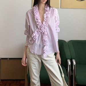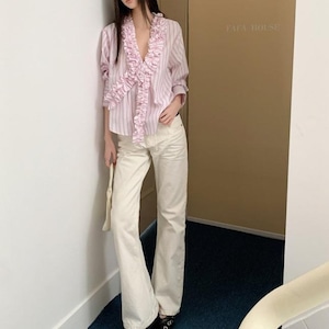 柔らかなピンクストライプに、大胆にあしらわれた立体フリル。