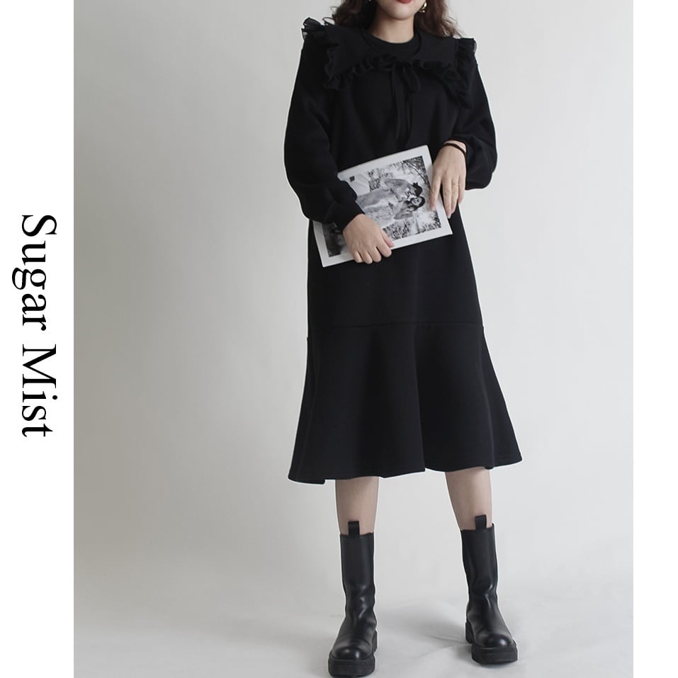大きな襟元がトレンドのフィッシュテールが揺れるワンピース