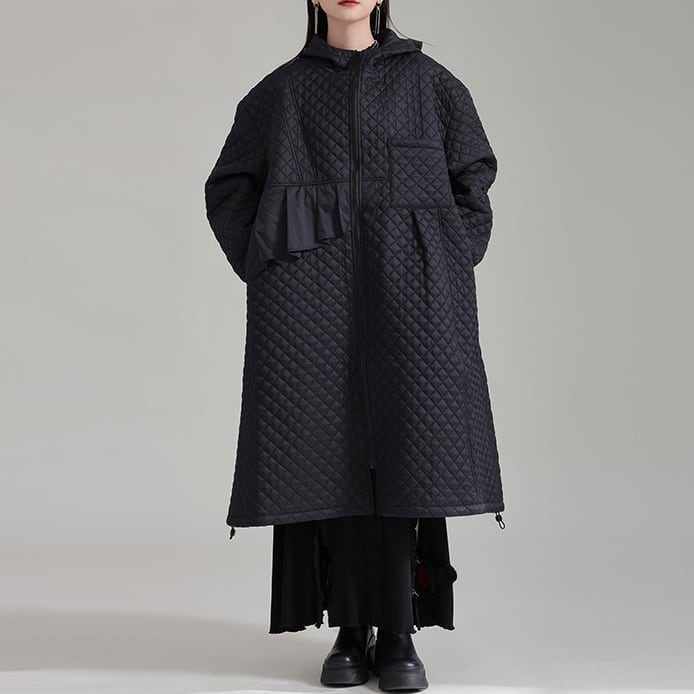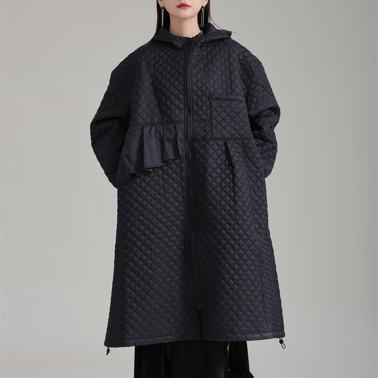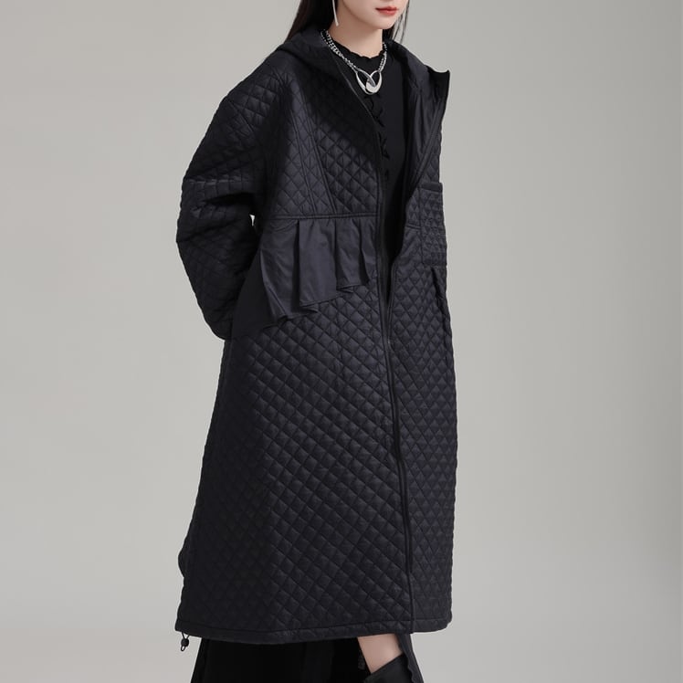 小さめのキルティングデザインとフード&フリルがプラスされフェミニンな印象もプラスします。カジュアルすぎない上品な印象に仕上がります。