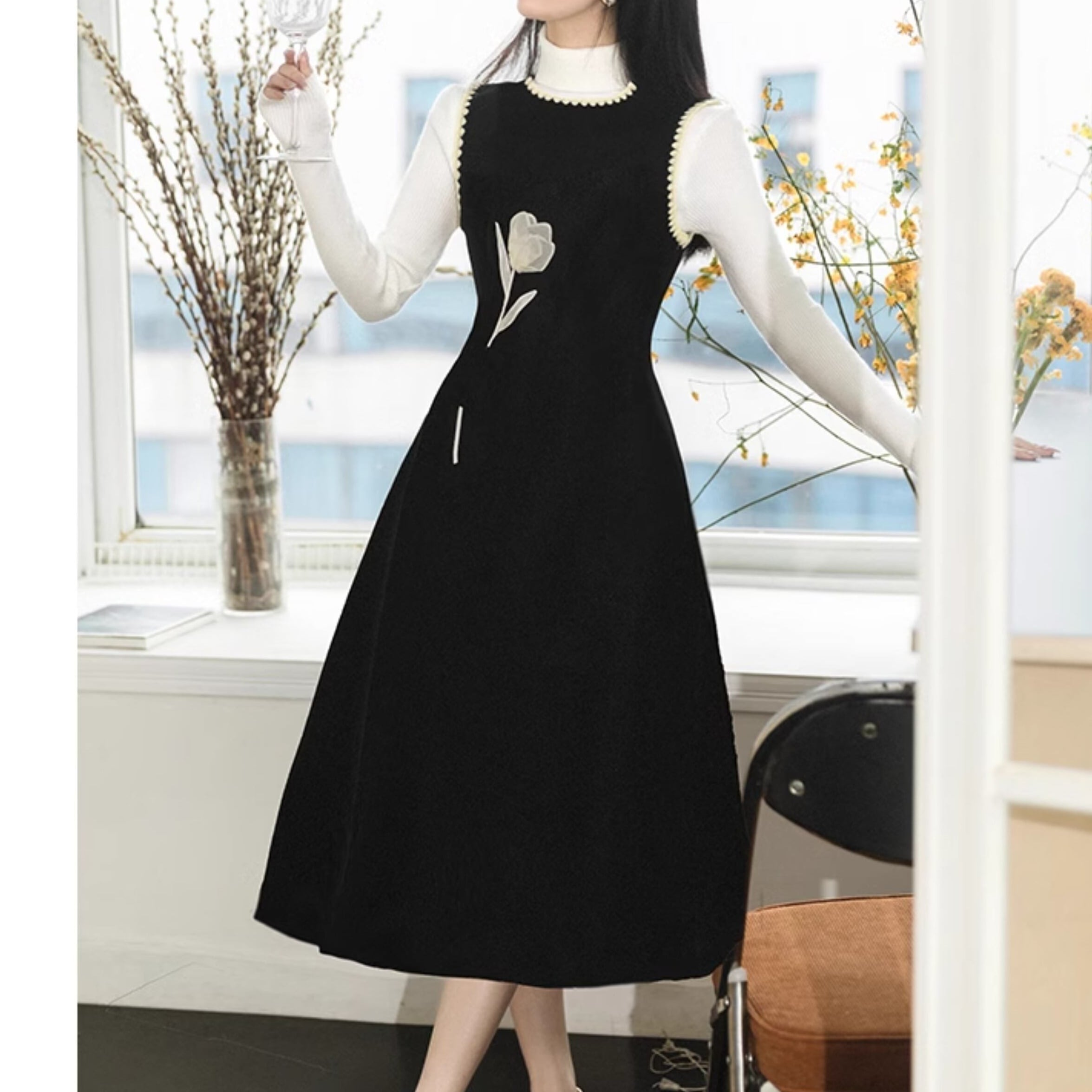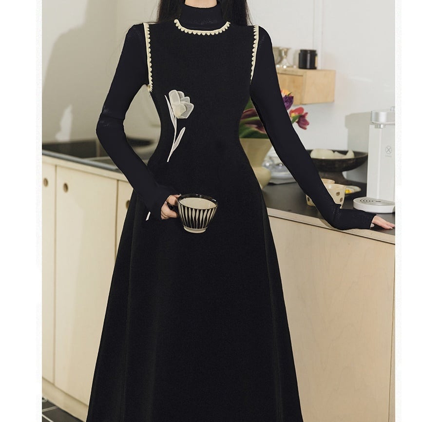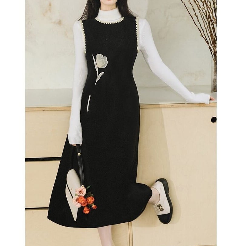 女性らしいAラインシルエットのニットワンピースとハイネックトップスのセットアップ。