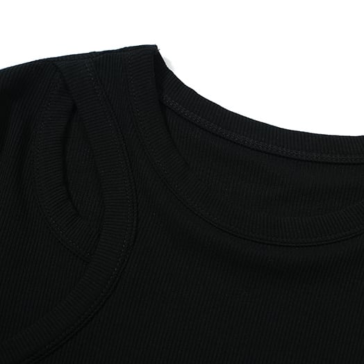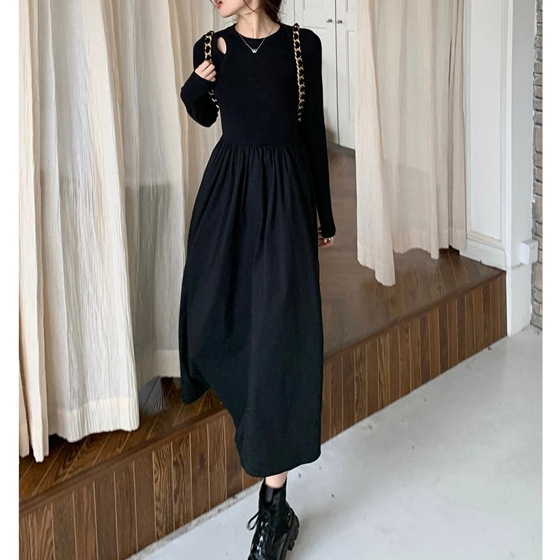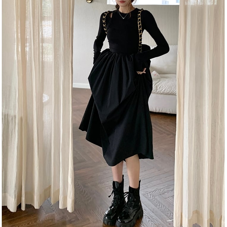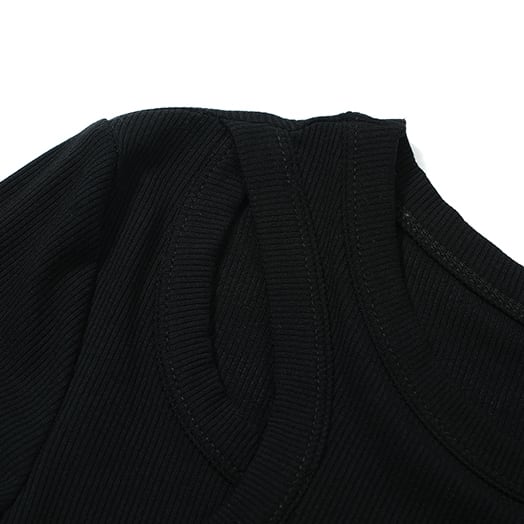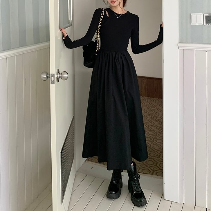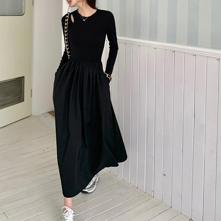 ショルダー部分のカットアウトデザインがアクセントを持たせ、ニットtopからの切り替え生地がメリハリのあるシルエットを作ります。