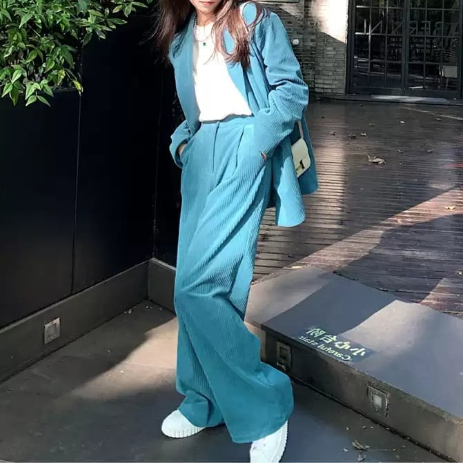 ルーズでマニッシュなシルエットのブルーカラーが目を惹くジャケットセットアップ