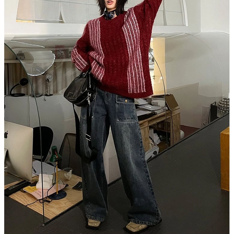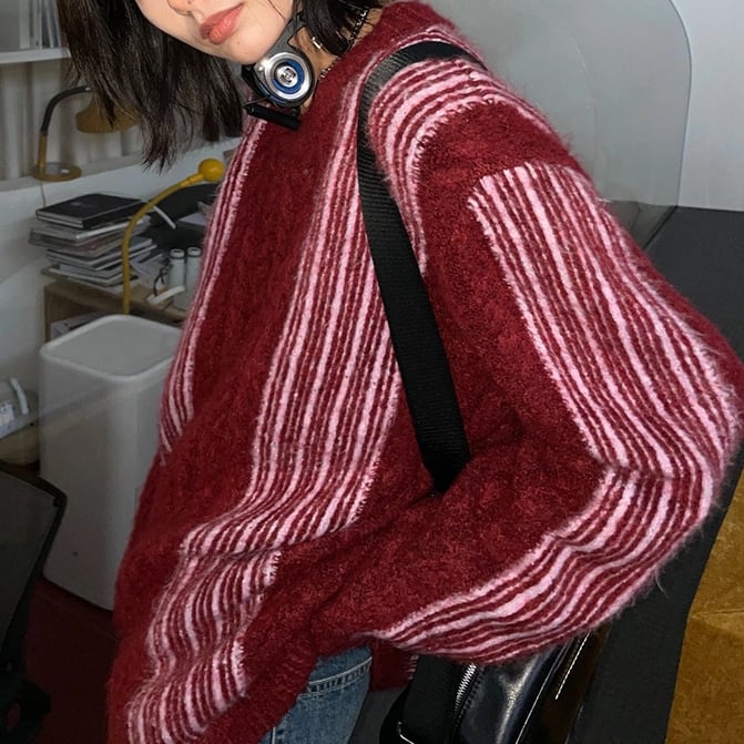 スポットのストライプデザインがレトロな雰囲気をプラスするニットプルオーバー